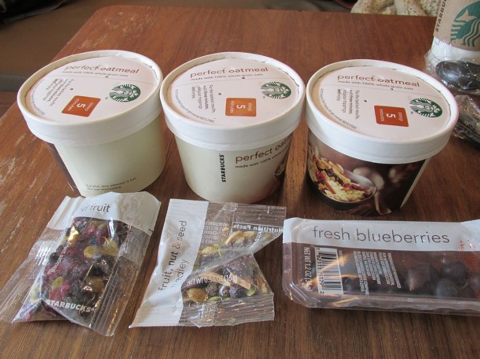 For breakfast go ahead and grab a bagel (multigrain or plain) or some oatmeal. Most coffee and tea can be made vegan by omitting the whipped cream and substituting almond milk for regular milk. You could also make most frappuccinos vegan by omitting whipped cream, substituting almond milk, and steering clear of java chips, caramel drizzle, and protein powder. But be careful because some things like drinks containing pumpkin spice, white mocha, caramel brûlée, and any light frappuccinos can’t be made vegan.
