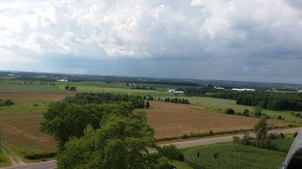 While the nearly 36 square miles are gridded with the straight, rectangular road system provided by the Public Land Survey System that quarters many Midwestern states, it is hardly a hindrance to the beauty of the land. From the top of any tall silo, or the crest of one of the highest points (near the corner of Cardinal Lane and Scotch Creek Road, or just west of State Highway 107), the true nature of the rural agricultural community can be seen almost completely, with the shadowy inselberg of Rib Mountain overlooking from afar. With lush green landscapes dotted with barns in various orientations--some red and some white, some utilized and some abandoned--their presence recalls the importance of the need for many farmsteads in a small area to supply the many cheese factories, once more numerous than bars. Despite the considerable clearing and control of the original forests for the immigrant settlers, the trees remain abundant, gracefully disrupting the bright green and browns of the fields with darker green. One specific line of trees marks the level path left behind from the railroad that brought goods and news back and forth in the early days of development.