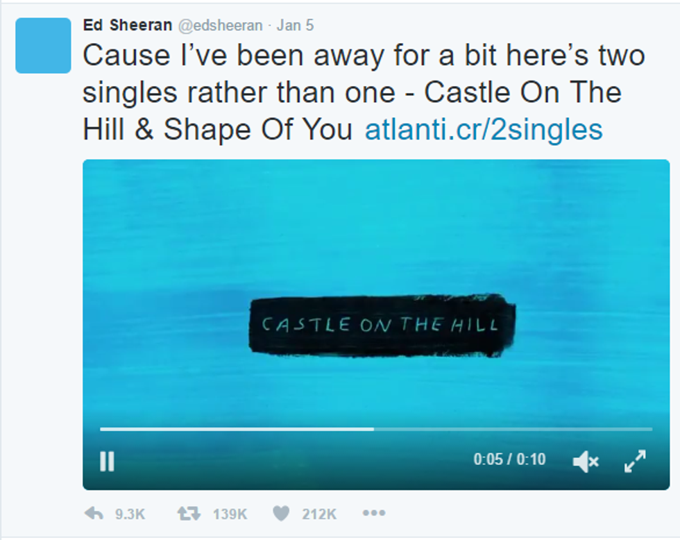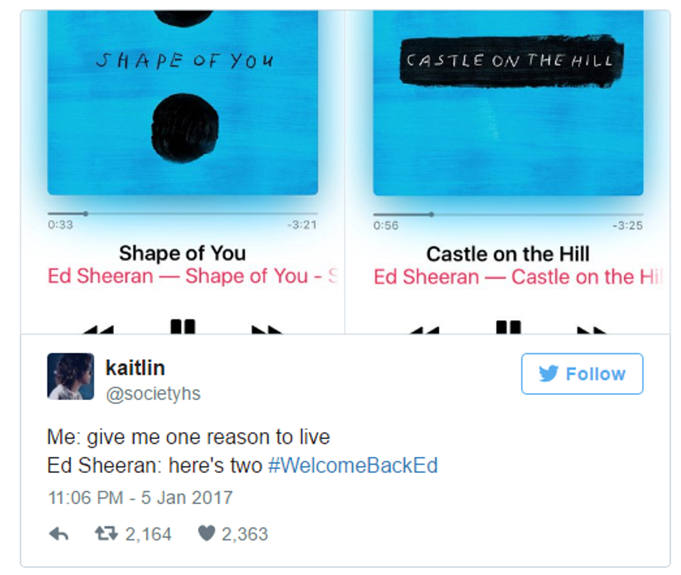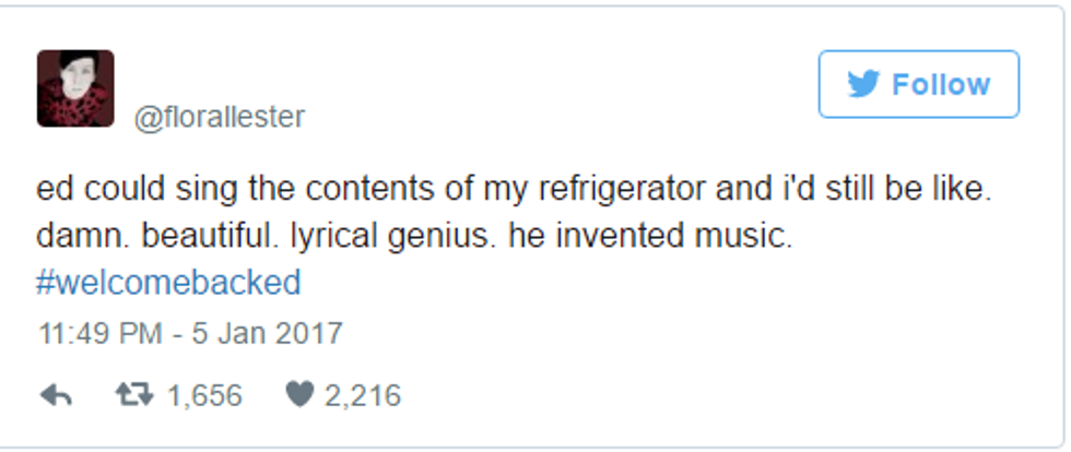 This is why I love Ed Sheeran, he's so chill and really loves his fans. I saw him in concert a few years back and he's so down to earth. He just walked on stage and was like "hey my name's Ed and I"m going to sing some songs. And once again he proved that he's the best. Not one but TWO singles and the world absolutely lost their minds.