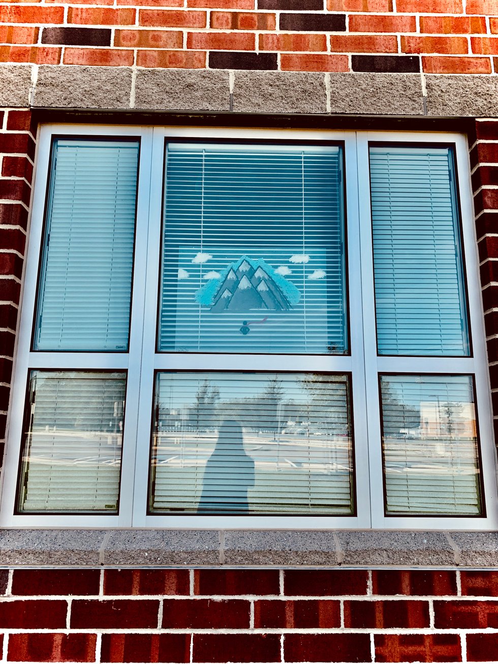 I walk at a consistent pace until I see a window. I look around to make sure no one is watching me. I walk right up to this one familiar window, but I don't look in. There's a small mountain range painted on it. There are six grey mountains with snow caps, light blue around them and three small white clouds on either side of the mountains. A couple inches down from the mountains is a figure in black. A shadow, with his arms on his hips, and a red scarf make him look as if it was flying in the wind. It looks as if he was looking up at the mountain range.