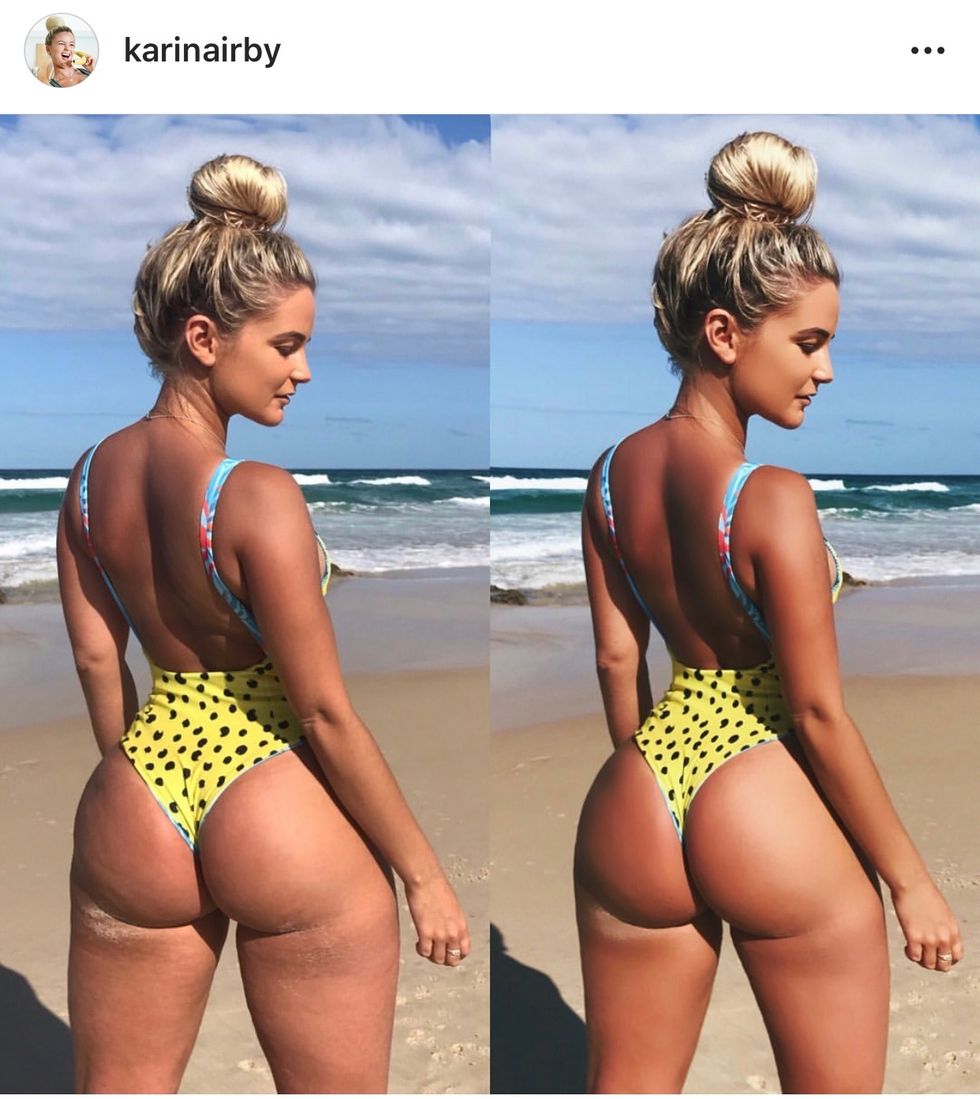 These photos are captioned by Karina with ways in which she edits them to make herself appear more appealing, and she includes the original photo for comparison. The photos have been linked back to her original page if you are interested in learning more about her statements on body distortion.