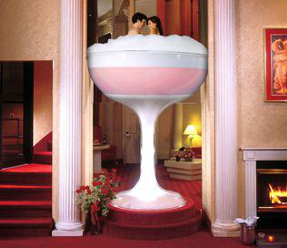 Before we even reached our destination, I guessed that our room was going to have a floor-to-ceiling glass bathtub shaped like a champagne glass and a heart-shaped bed (I’d seen enough corny Poconos commercials in the 1980s to have some idea of what to expect).