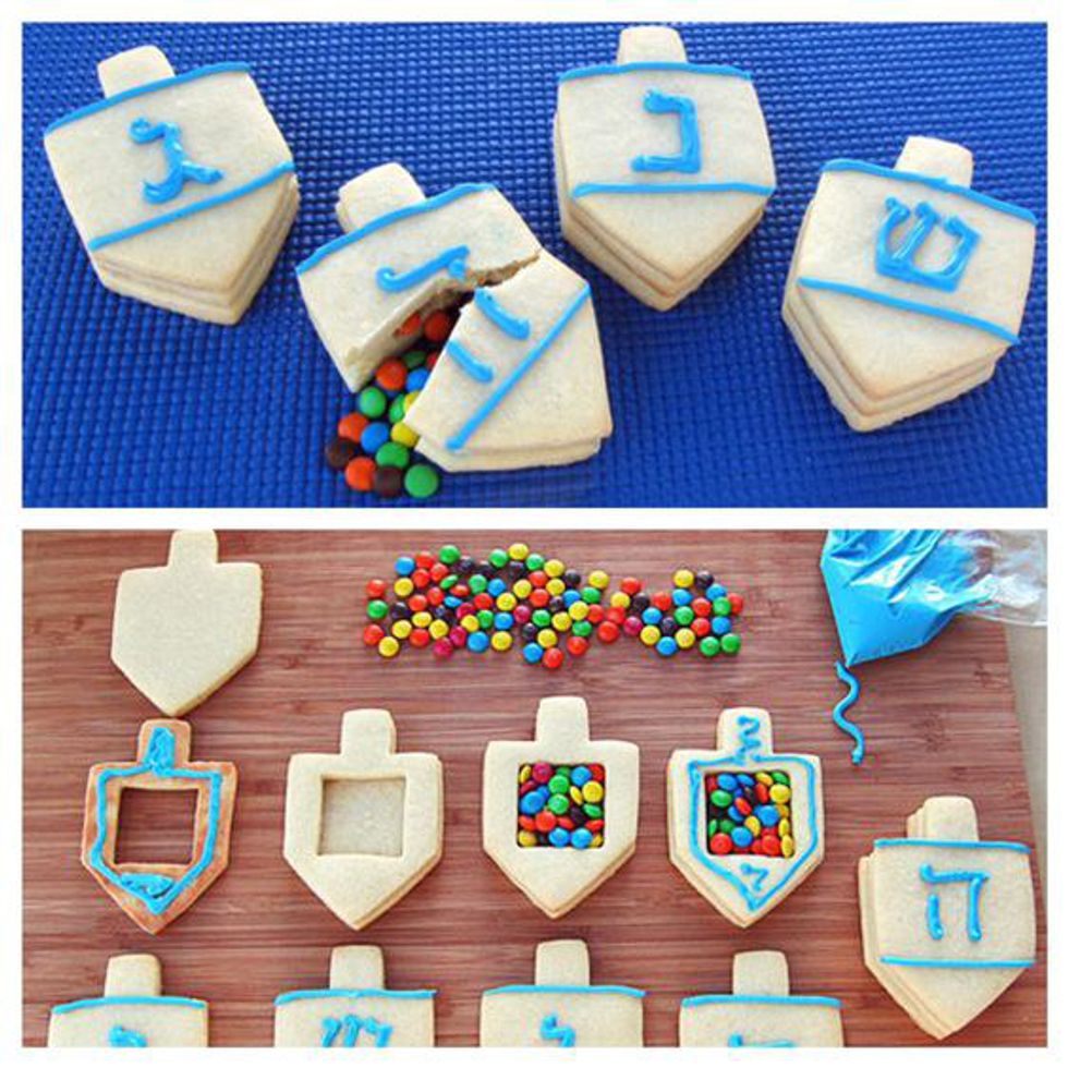 This is a fun twist on the classic Hanukkah sugar cookie. While the sugar cookie, icing, and sprinkles already make a dynamic combo; the hidden chocolate gelt inside only brings these cookies to next-level status. Dreidel cookies with a surprise are sure to be a crowd winner!
