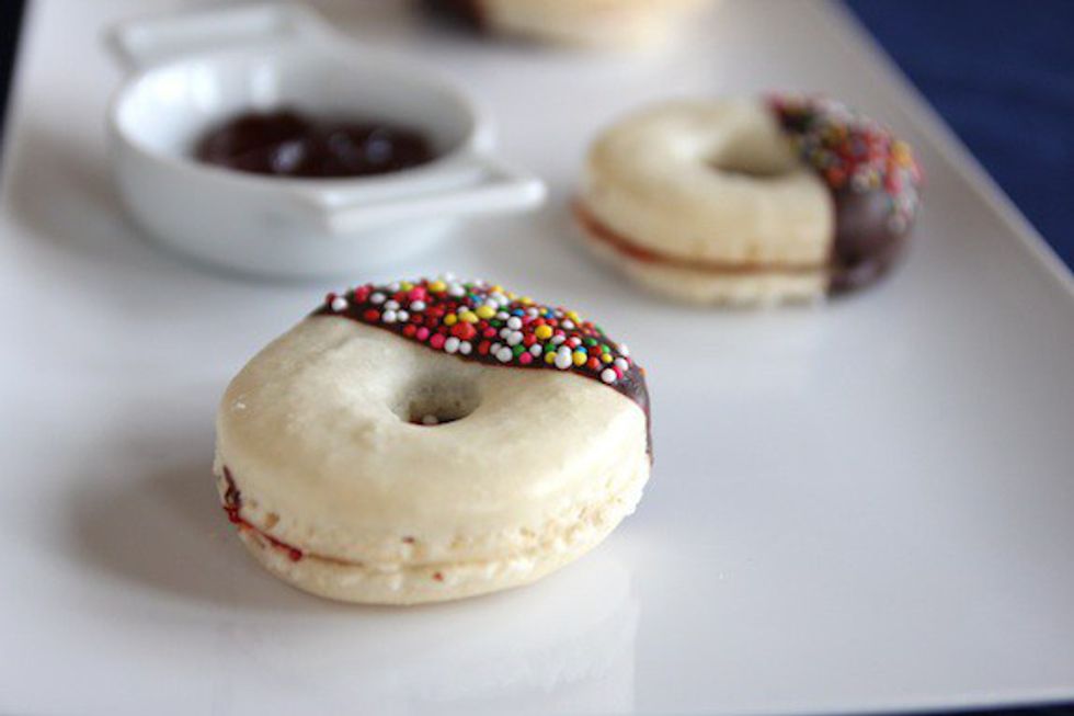 A crossover between the traditional Hanukkah jelly donut (sufganiyot) and French Macarons. How’s that for a unique Hanukkah dessert? Wrapped up with a cute blue ribbon, these can be the perfect Hanukkah gift.