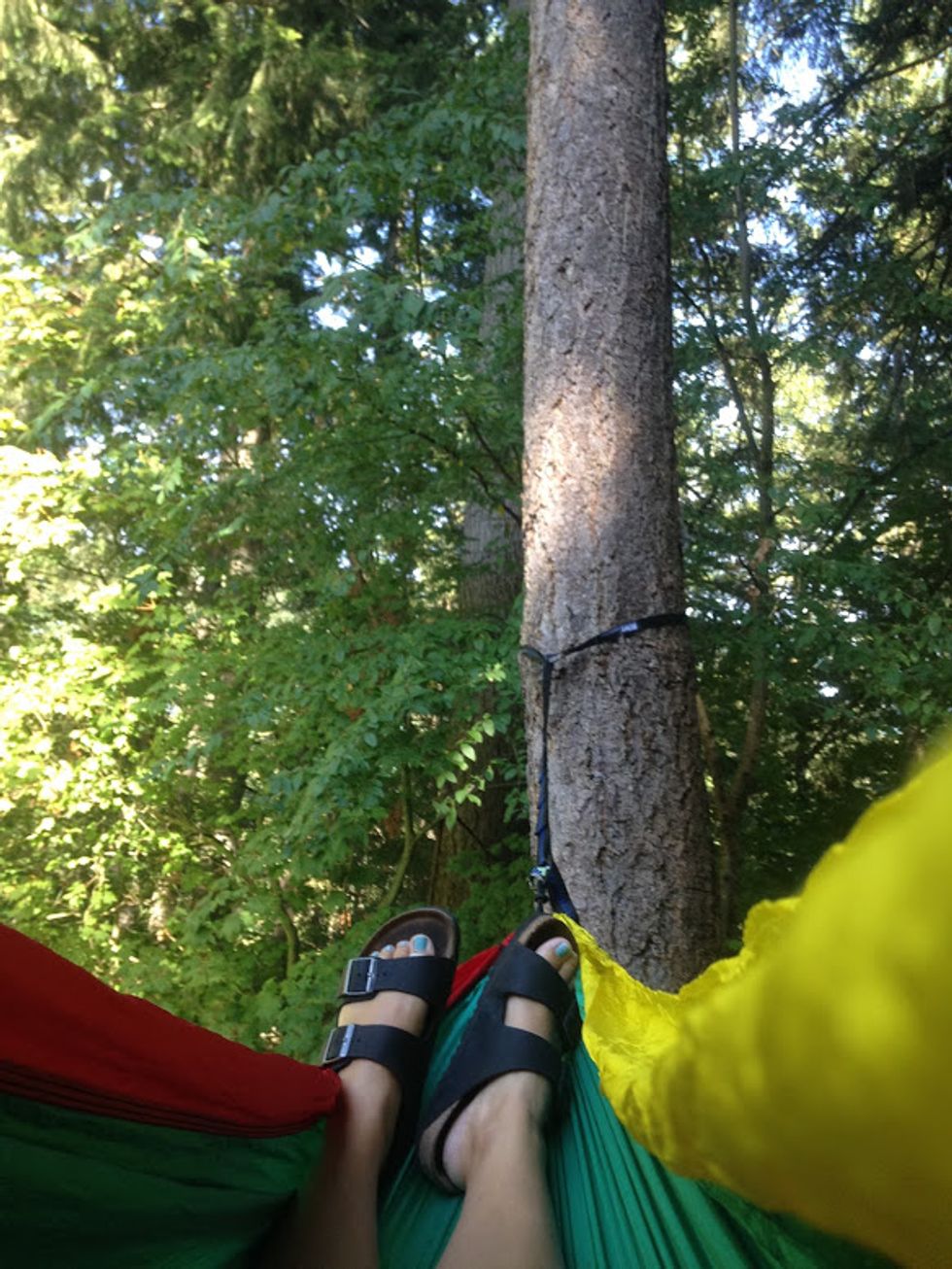 This one has an unusual story behind it. My friend Leslie and I desperately wanted to hammock. It was the first sunny day in ages and we had no idea where to go to find a good spot, so we improvised. She parked her car a little less than a full space away from mine, and we both rolled down all the windows in our cars. We then wrapped our straps around the roof and strung our hammocks up. With some music playing and snacks in hand, we got to soak up the warm weather in our favorite place. We got some very strange looks from all the passersby but I would absolutely do it again.