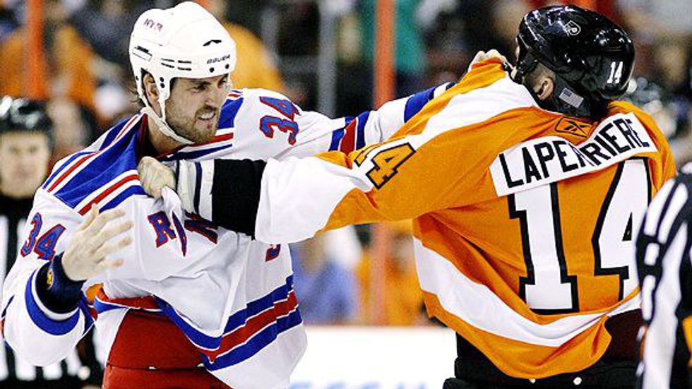 New York Rangers defenseman Dan Girardi was battling for the puck in the corner, and the next thing he knew, the play had to be stopped because by some act of God, the puck managed to wedge itself perfectly between his left eye and his visor. The fast-paced action makes hockey one of the most unpredictable sports in the world — anything can happen, even something as crazy as that.5. The fights