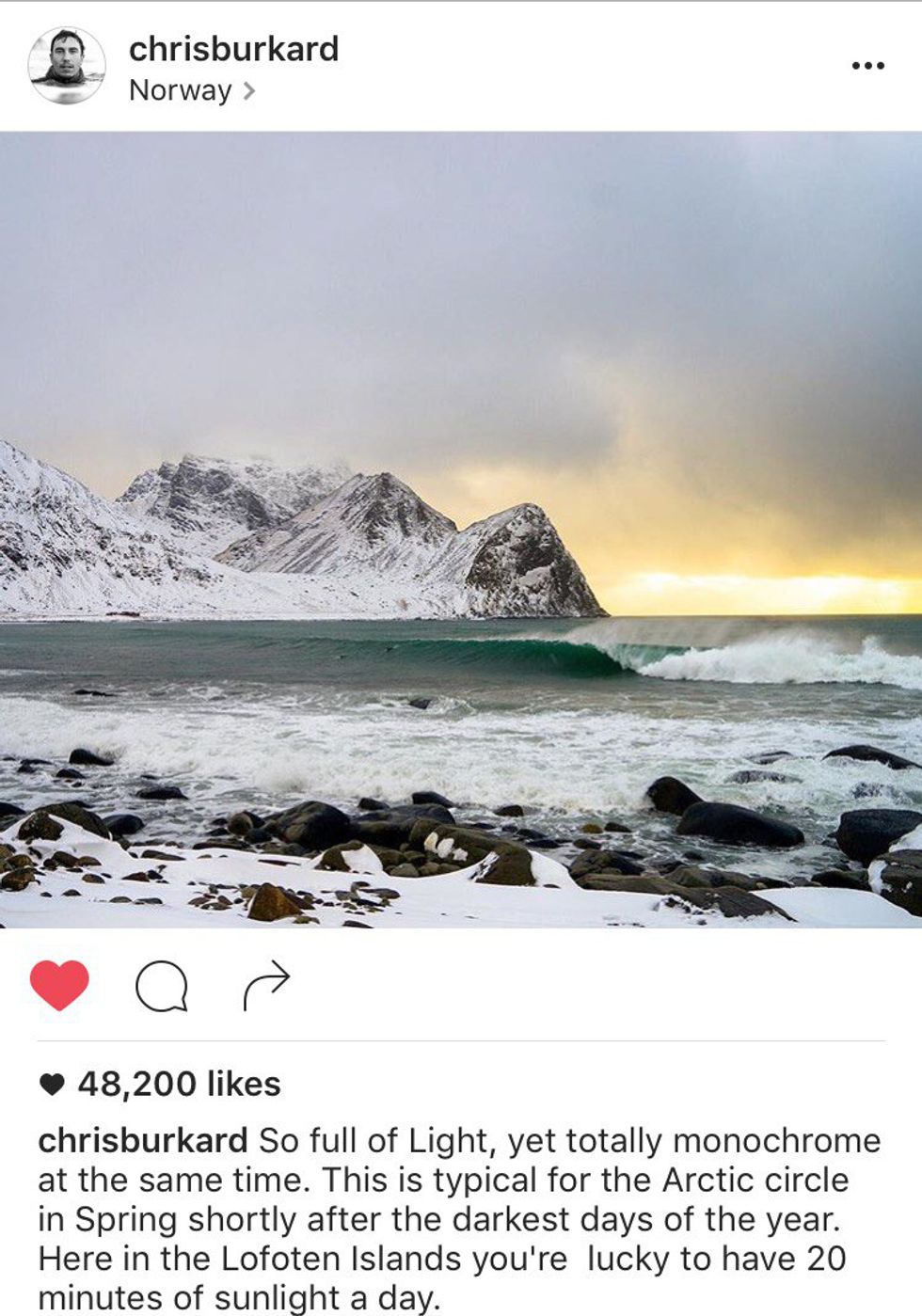 Chris Burkard is Insta-official. His photos encapsulate a large portion of the world as well, going from one moment in Portland, Oregon, immediately to the Blue Pools of New Zealand. And his captions further enhance his eye.