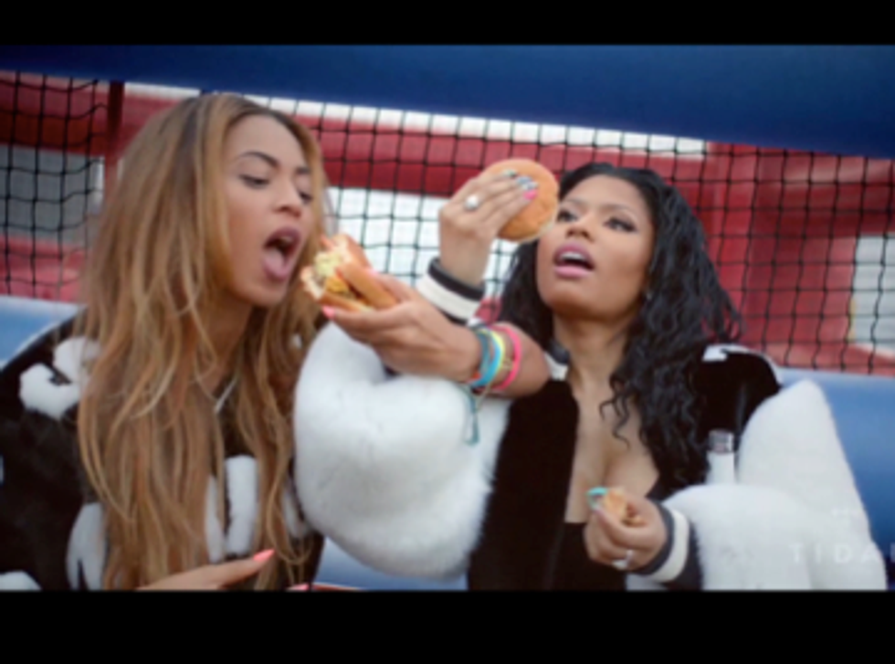 4. Many people believe that Hollywood stars are constantly dieting because they aren't “real" people; however, Beyonce and Nicki are not afraid to chow down on an In-N-Out burger with some fries.