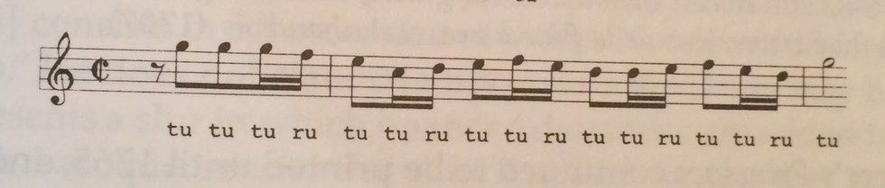 The most common syllable that is used when articulating half notes, whole notes, quarter notes, some eighth notes, and notes that needs to be repeated or leaped is tu. When the note is diatonic, it is suggested to use the articulation ru, but it all depends on the tempo. In Figure 3, the meter is suggesting a faster tempo so the articulation will need to be more detached, and that’s where the syllable tu comes into play. If you notice, ru has been placed on the diatonic notes (the second sixteenth note) to better connect it to the next note which will need to be tongued as tu.