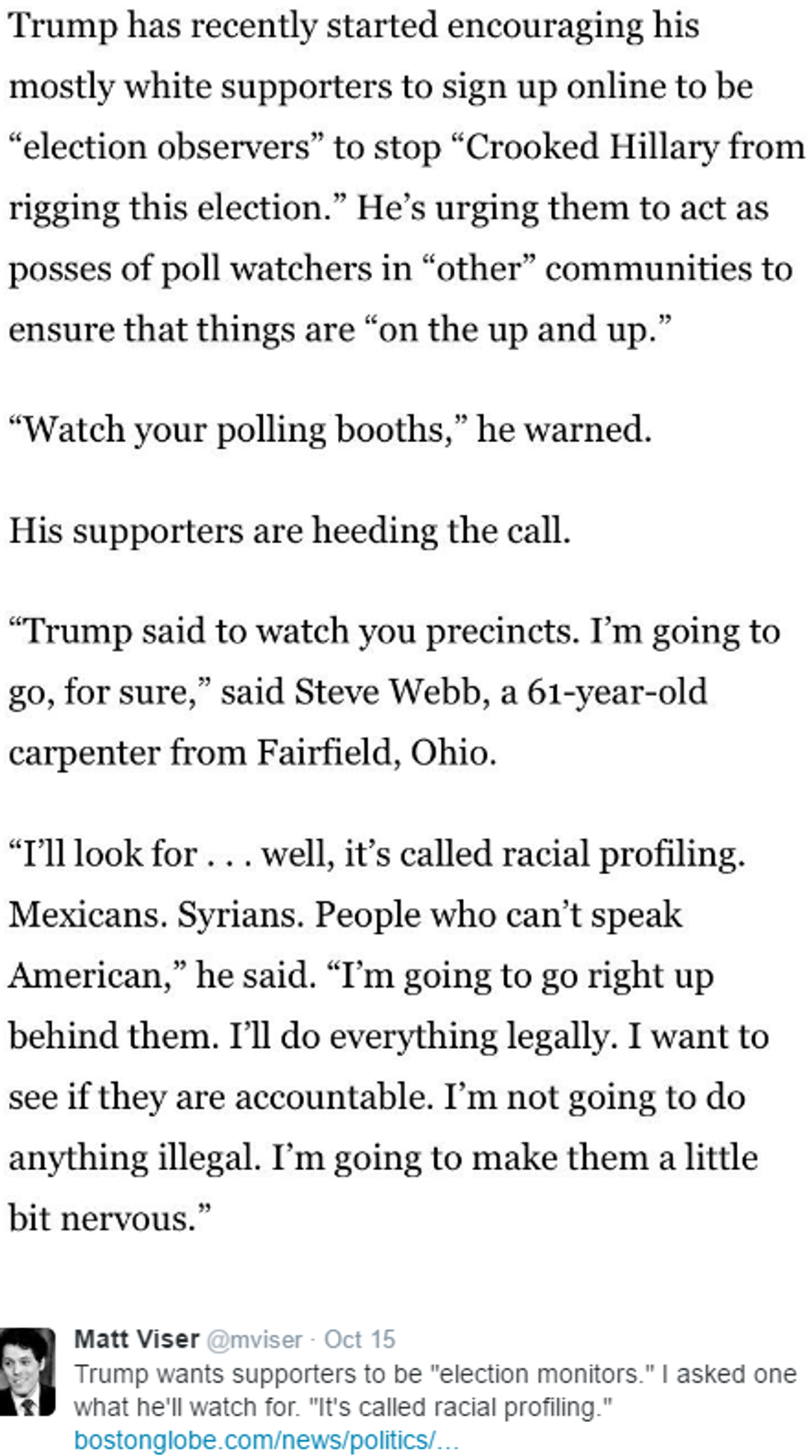 Now, I live in Indiana and have so my entire life. There is a multitude of Trump supporters near my polling area. I see their “Make America Great” signs as I am driving and I can’t help but wonder if one of them will be attempting to intimidate me on November 8th. I have faced racism before. I’ve been called things like “Sand N**ger, beaner, and literally any other derogatory thing you can say about Mexicans I have been called. Even though I am half Indian and not Hispanic, it doesn’t matter. I look a certain way and therefore am placed in a certain category by people like that Trump supporter in the above quote.I’m not one to back down or be intimidated by words or threats such as these, but I am actually nervous for election day. What if someone thinks I can’t “speak American” and attempts to intimidate me and do whatever else he or she deems fit? This election has officially divided people in this country and if you don’t look like what people think an American should look like, then you are subject to not only voter intimidation but blatant racism by Trump and his supporters. By claiming the election is rigged he is planting the seed in many people’s mind that if he loses (which he will) it will be because of voter fraud and the media.