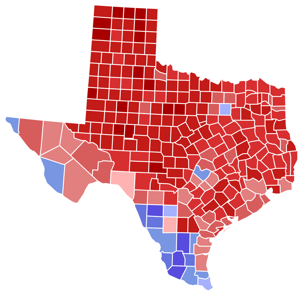 As you can see above, Donald Trump won the majority in Texas last night by securing the largest percent of the popular vote with 53%. Due to Trump securing the majority in Texas for the Republican Party; Texas was then colored solid red and the prospective electoral votes are then cast in favor of Donald Trump.