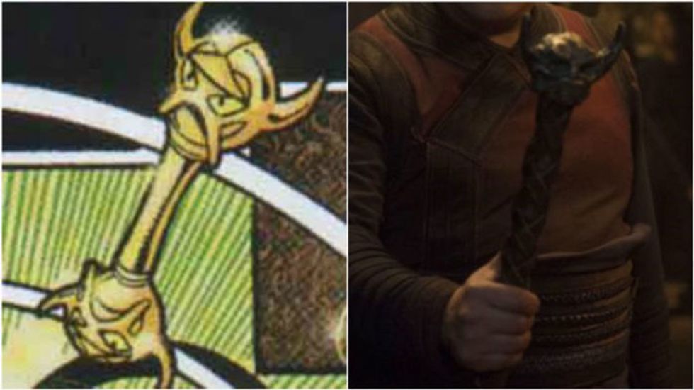 Hey, it's the Wand of Watoomb! This thing has a very long history of being used by evildoers, but in the film it's used by Wong in his off screen battle with Kaecilius. It usually doesn't have any special powers beyond being a powerful boost to a sorcerer's magic. Fun fact: It's also what prompted Dr. Strange and Spider-Man to have their first team up!5. The Staff of One and Tina Minoru