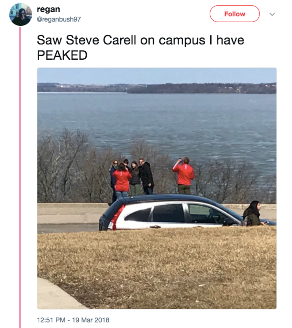 Close up selfies of students with Carell soon confirmed that he really was on campus and some students said they dropped everything they were doing — including going to class and studying for midterms — just to search for him.