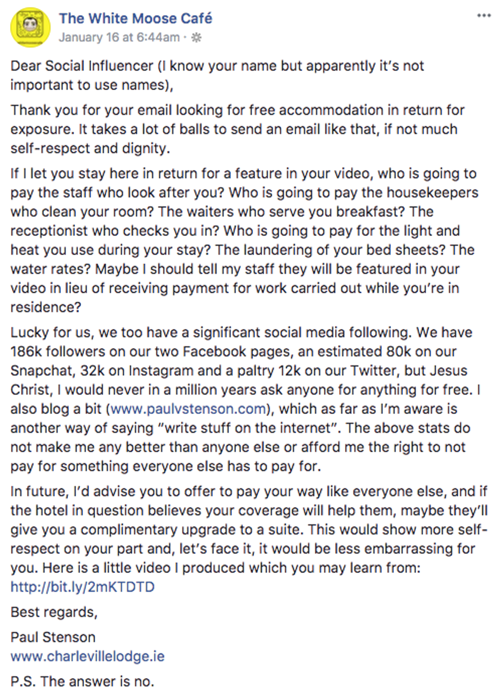 Elle Darby is a 22-year-old social media influencer from Bath, England. She describes herself as a "fitness, beauty, and lifestyle YouTuber" with the slogan "you do you boo." She has been vlogging since 2015, and her YouTube channel includes workout sessions, fashion hauls and videos of daily life. Recently, Darby was catapulted into the spotlight over a controversial Facebook post by The White Moose Café, a restaurant and hotel in Dublin, Ireland. They anonymously shared an email they had received, which claimed to be a business proposal, essentially asking for a free four-day stay in exchange for social media exposure.