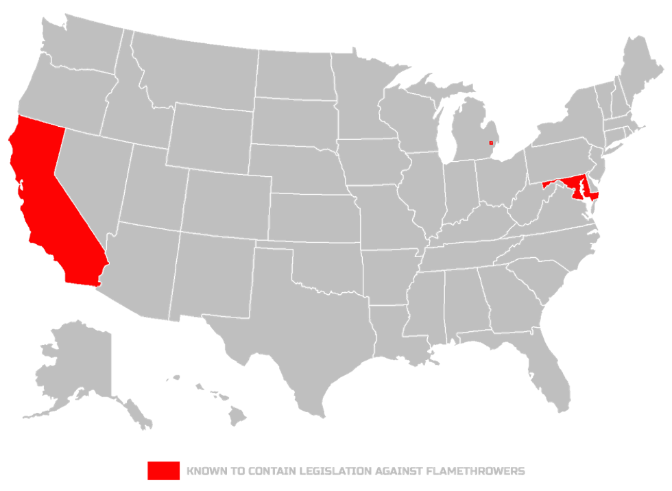 Maryland is the grouch state in regards to flame-throwing so it's a complete no-go there and California requires a permit, but other than those two states, you have free range to do as you please.