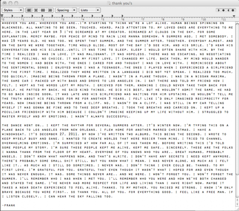 In spring of 2012 Frank Ocean came seemingly out of nowhere with his single "Thinkin' Bout You" which was later discovered to be the first single off his debut studio album channel ORANGE. Ocean quickly became a massive success and we have been searching for him ever since.