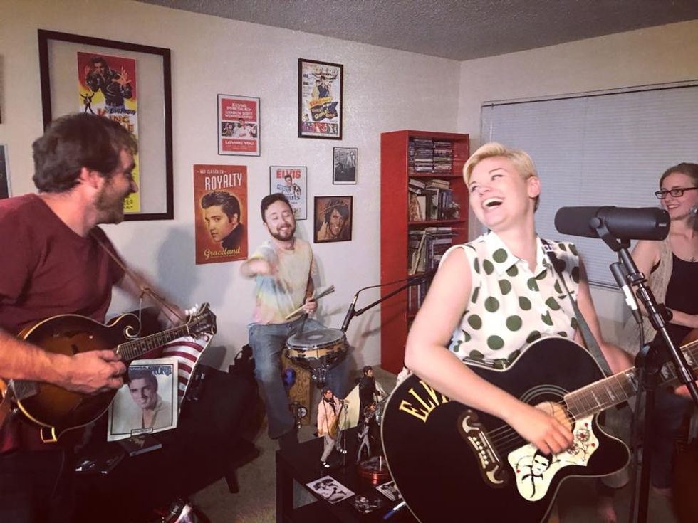 She praised the connections and friendships she has found in the Elvis community. Inspired by Elvis’s ability to bring all kinds of people together with music, Amanda Lyn collaborated with other musicians to help bring her musical stylings to life (pictured below): Matt Juliano (mandolin) and Justin Braun (percussion) are members of a local acoustic Americana band called Beemo, and myself (upright bass). Vital to the process was Wholehearted Productions, the studio responsible for the recording and post-production aspects of the process.