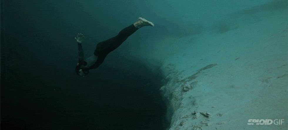 (I have included the video source of the above gif of free diver Guillaume Néry diving into an abyss. It is terrifying, surreal, and calming).