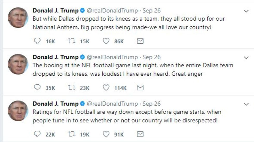 "This is his form of distraction, plus he gets an enormous reaction when he attacks the NFL, so we focus on that instead of talking Puerto Rico or gun reform for Nevada or these horrible tragedies, and he's bored and would rather cause a Twitter storm with the Packers." — Eminem