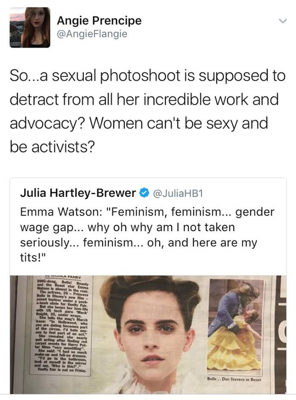 Their argument is that feminism is against naked photos of women, as it objectifies them and over-sexualizes their bodies. As a feminist, Emma is contradicting her own beliefs by posing for a racy photo and exposing herself.