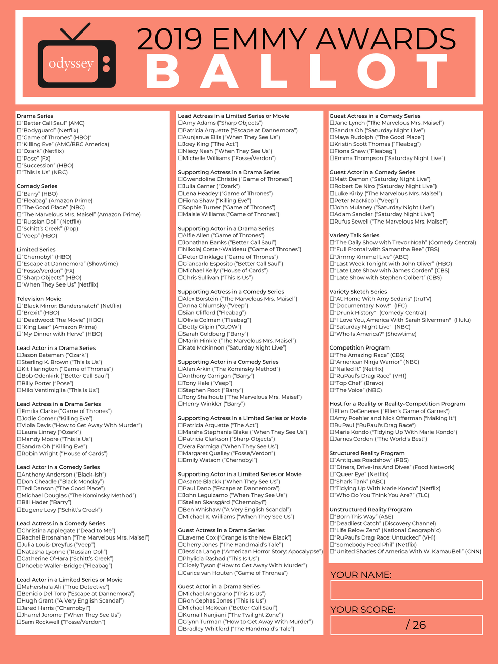 Now that Emmy Sunday is finally here, it's time to finalize your predictions with our printable 2019 Emmy Awards ballot.