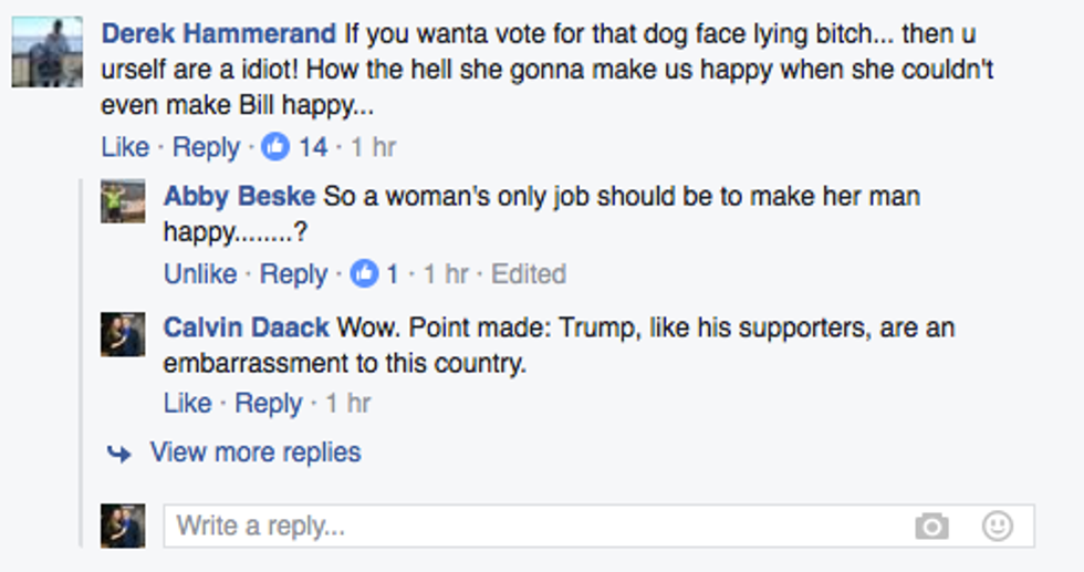 My immediate reaction was laughter. I couldn’t believe I was reading comments like this from kids I went to high school with. But once I realized that these are actual thoughts that came from actual human beings that are actually going to vote, my reaction turned sour. I had a truly visceral response of disgust and discomfort. My blood boiled after I saw misogynistic and ill-informed opinions, comment after comment.