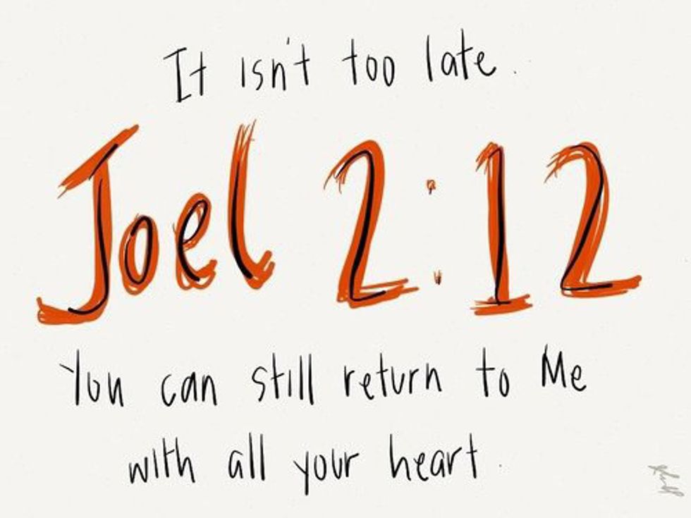 1. Joel 2:12 says, "It isn't too late. You can still return to Me with all your heart."