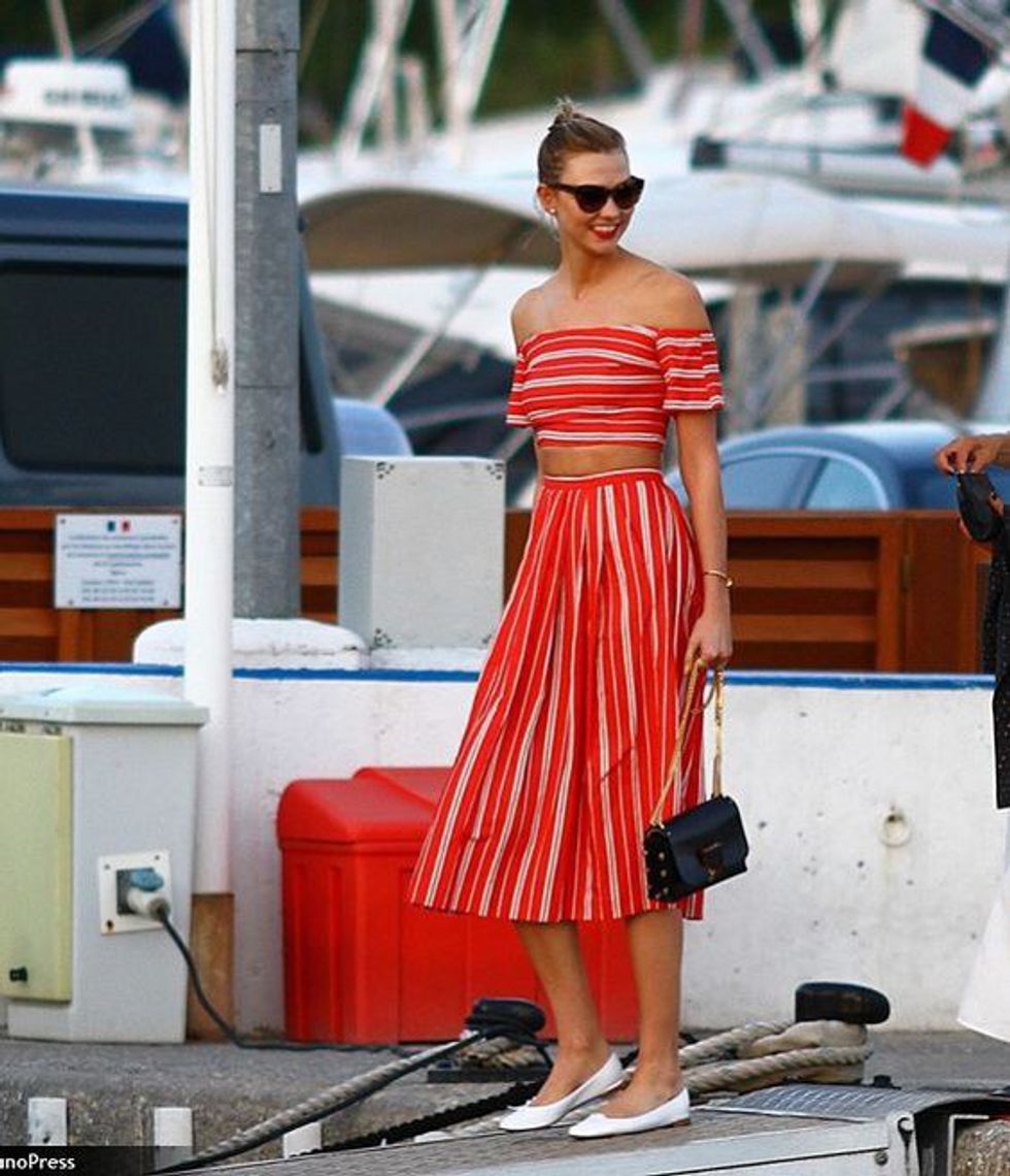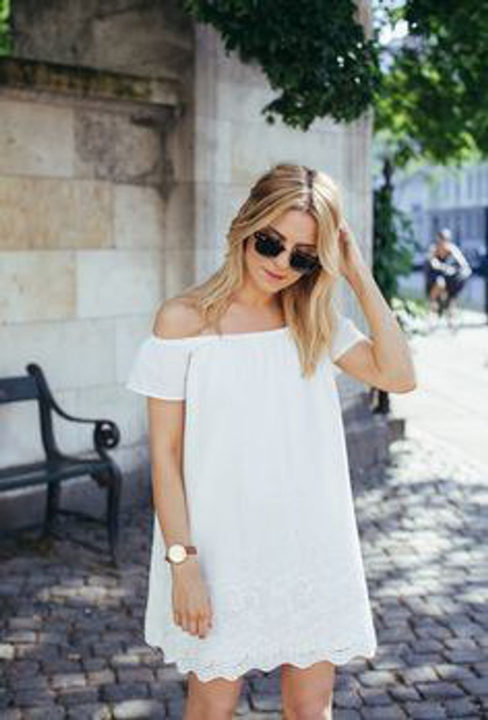 The first look is this white dress. Off-the-shoulder dresses are really in right now, as well as the color white. You can pair this dress with pretty much anything. Brown sandals would go great. You can add accessories like the glasses seen in the picture and maybe a straw hat. The white really allows anything to go with it.