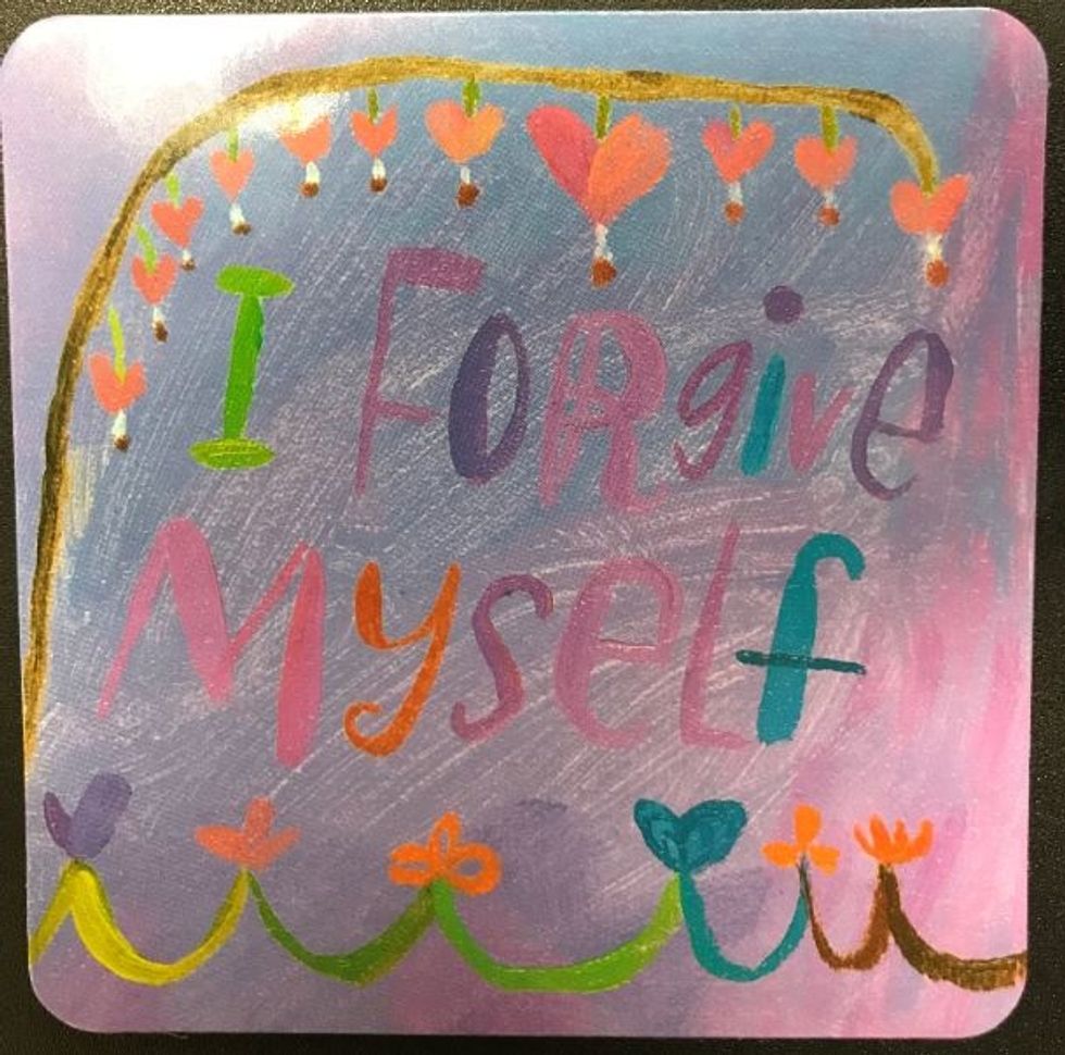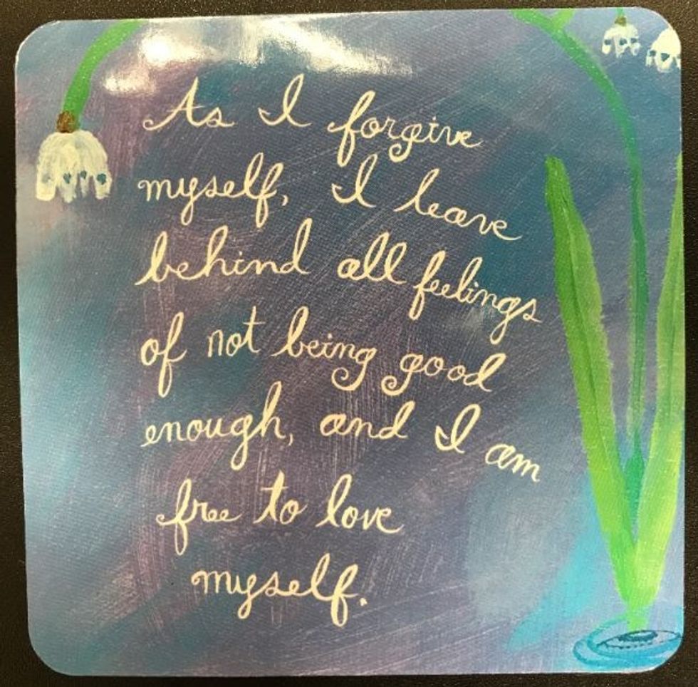 On one side, the card read, "I forgive myself." On the other side, it read, "As I forgive myself, I leave behind all feelings of not being good enough, and I am free to love myself."