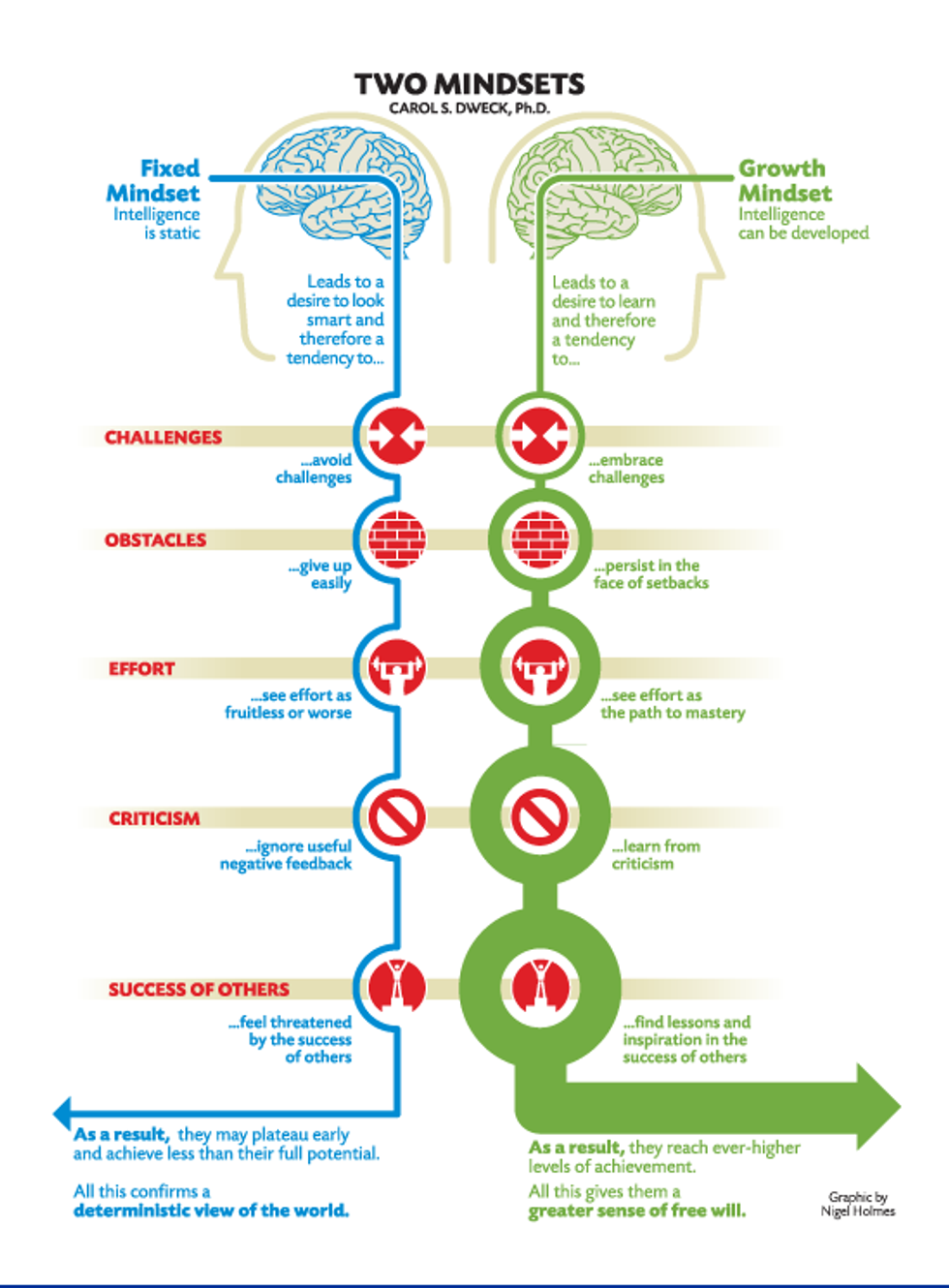 What: Growth Mindset is: The Belief that with practice, perseverance, and effort, people have limitless potential to learn and grow. People operating in the growth mindset tackle challenges with aplomb, unconcerned with making mistakes or being embarrassed, focusing instead on the process of growth (Dweck p. 16). On the other hand, a fixed-mindset is: the belief that we're born with a fixed amount of intelligence and ability. People operating in the fixed mindset are prone to avoiding challenges and failures, thereby robbing themselves of a life rich in experience and learning (Dweck pgs. 15-16).
