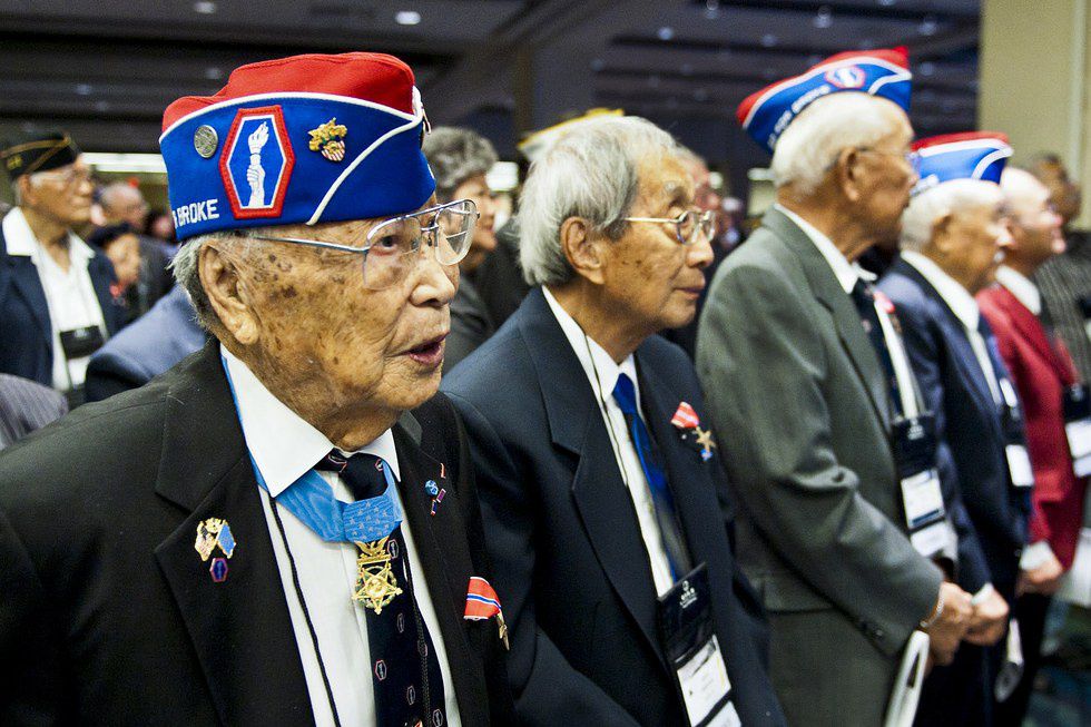 Along with jobs inside the camps came the "opportunity" to walk outside the fence when more soldiers were needed for the war effort - You remember, the one the Japanese were trying to sabotage? There is a tragic irony in that both men and woman were asked to join the military and fight for a country that didn't want them walking freely down the streets. The 442nd Infantry Regiment was almost exclusively made up of Japanese Americans. The regiment fought in some of the most dangerous battles of the war and became the most decorated unit of its size and service. Meanwhile, internees were forced to make American flags both for domestic and military use, work that to me sounds more like writing "I'm a Loyal American" over and over again on a chalkboard as punishment. Mr. Takei laments the injustice of having those same flags returned to interned family members when one of those brave soldiers had fallen, fighting for a freedom none of them may ever see.
