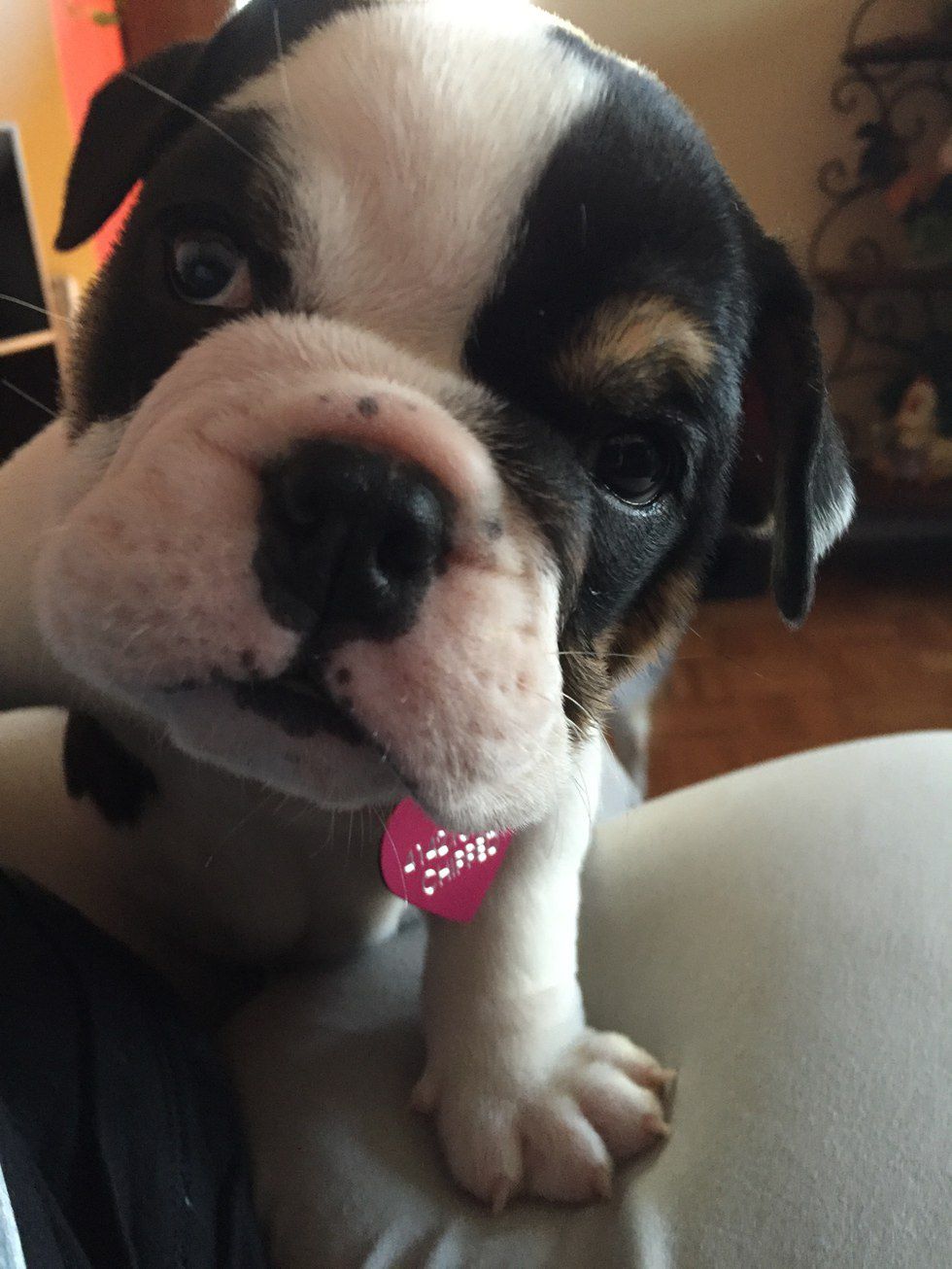So if you haven't figured out by now that I'm in love with dogs, where have you been? Anyway, dogs are a huge part of my life and recently my family added two more dogs to our family, two English Bulldogs. We have had bulldogs in the past, and my mom has been wanting another one for a long time. That is where Maggie May comes in. I arrived home one Sunday after work to a mother that was anxious for some reason. Needless to say, she was waiting for me to walk into the living room to see my reaction to the newest addition to the family. My reaction was like a small child's reaction on Christmas morning, I was completely surprised to see this tiny puppy sitting on my stepdad's lap and then I cried because I was so happy. Not only has my mom been wanting a bulldog for a long time, but I've been wanting another dog for just as long. The only difference is I didn't care what kind of dog we got. I was completely happy to have Maggie apart of our family. We like to call her the cow because of her black and white markings.