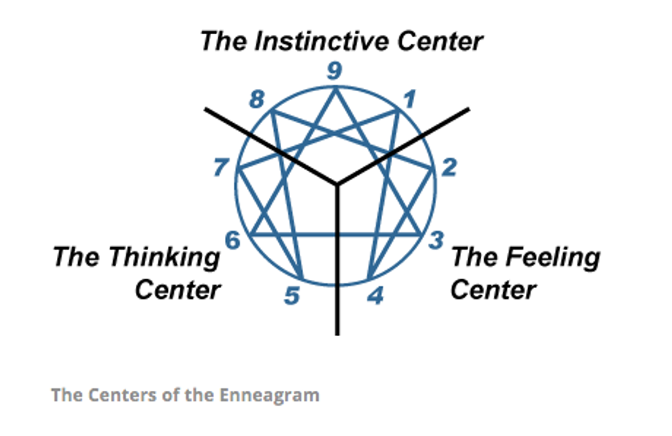 Each personality type is described by four keywords. Now, this is where the Enneagram can get a little confusing. The Enneagram is a 3x3 arrangement, which means the nine personality types are divided into three Centers, the Instinctive Center, the Feeling Center, and the Thinking Center. Each Center contains three personality types that display assets and qualities of the Center in which it is located. Check out this graphic for a visual: