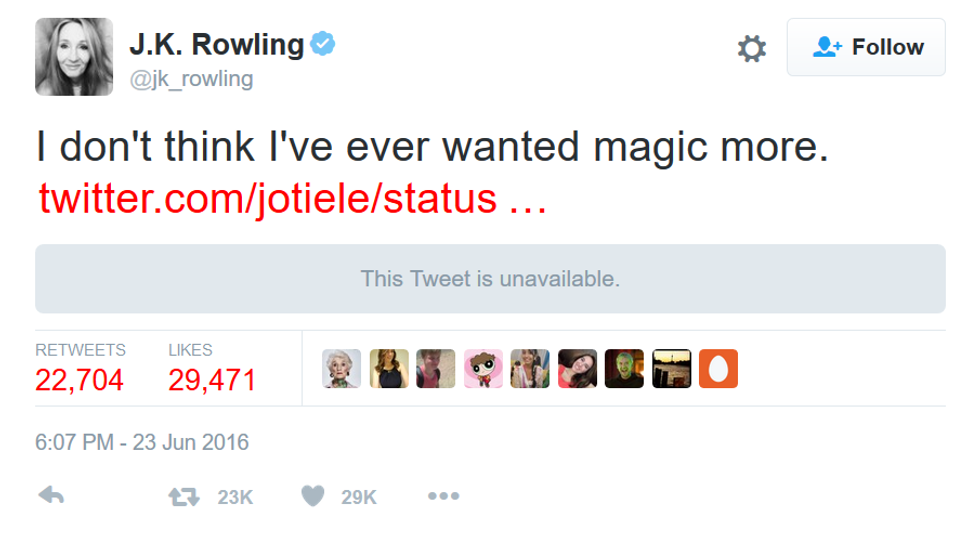 8. Brexit. Whenever J.K. Rowling voices her disappointment with politics over social media, you know it was a bad move. It’s her word above all. J.K. Rowling thinks with her heart, yet has the most logical views of any influential figure I follow. Okay, let me stop before this turns into a love letter.