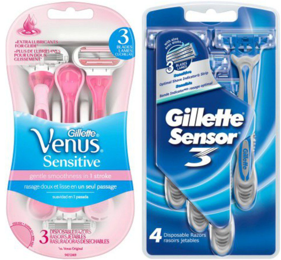 Women's: $3.74 vs. Men's: $3.54. This one wasn't as bad as I expected, but I assume it isn't worse since women are paying a nearly a full dollar extra for one less razor.
