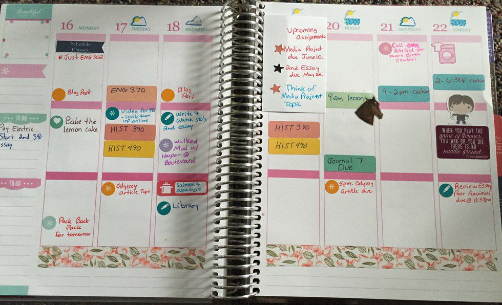 This is what a typical week looks like for me (above). In a planner, you can log what you're going to cook, when classes are, lesson times, days to do laundry and other important factors of your life. The best thing about Erin Condren planners is the amount of Etsy shops that specialize in making custom washi-tape and stickers. All you have to do is email the individual shops and ask for a specific type of sticker and they can make it for you. I have stickers that I specifically use for "Game of Thrones" episodes, ones to show when I will be riding (the horse's head), and little crock pots for meals. I even have sticker sheets that go with the themes of the months.
