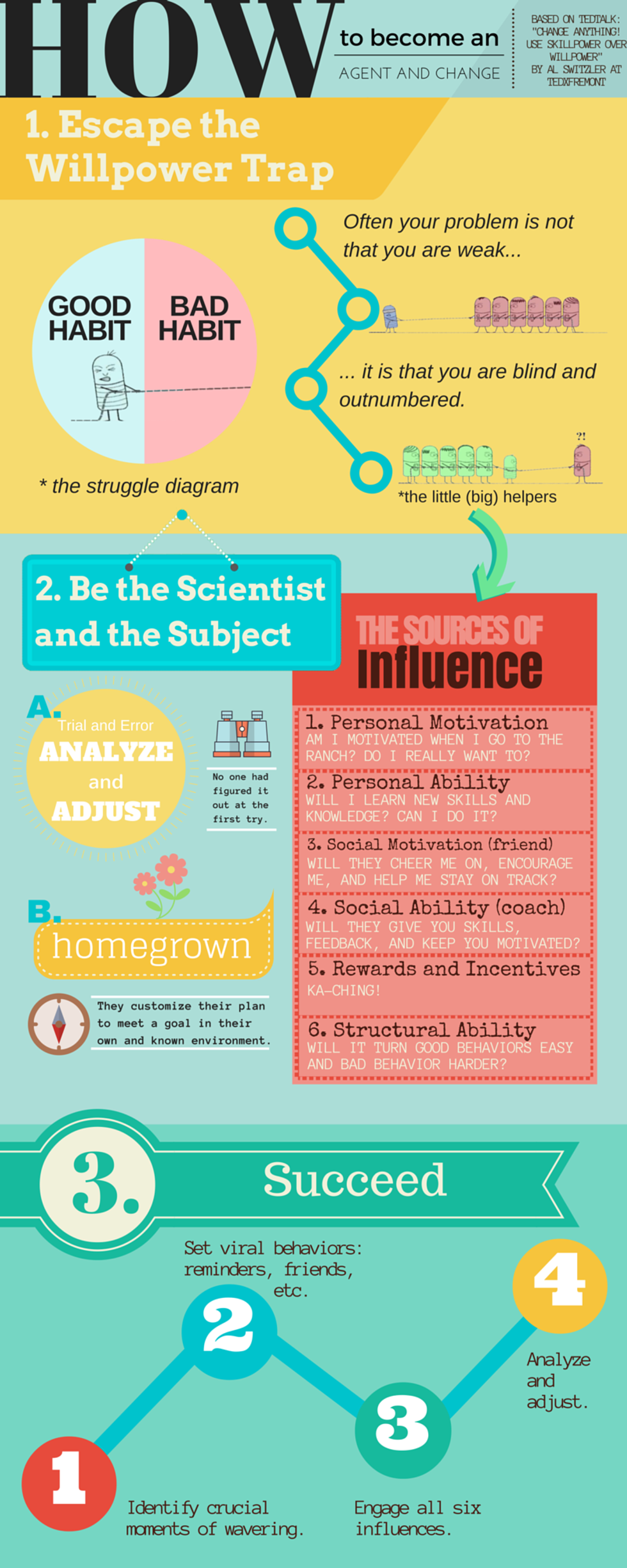 When we think about finishing a task or sticking to a new habit, we think we only need to have enough willpower. Willpower will get us through and everything else comes with that. This path of thinking is not very healthy and actually diminishes our chances to really change a habit. According to Al Switzler, if we think Willpower is all we need “we are outnumbered and blinded” and don’t see all the other agents responsible to help us change a habit.
