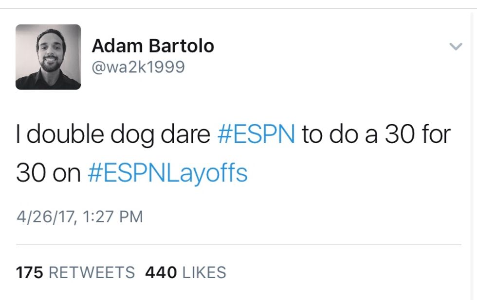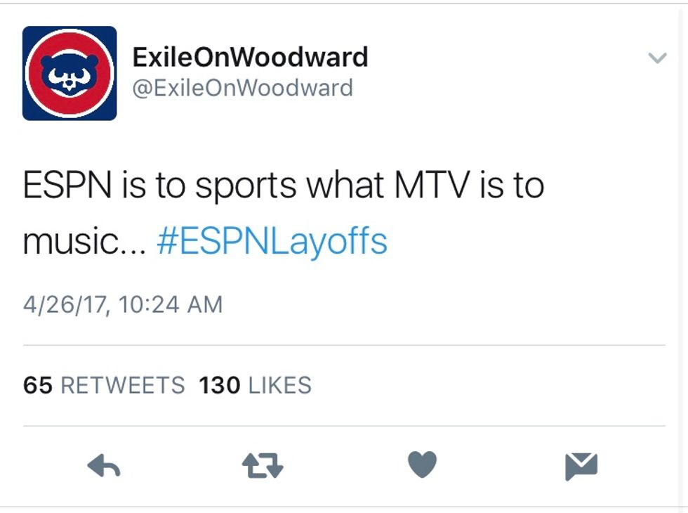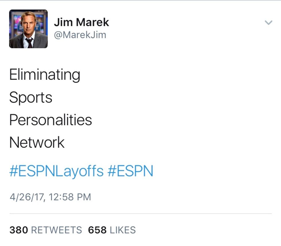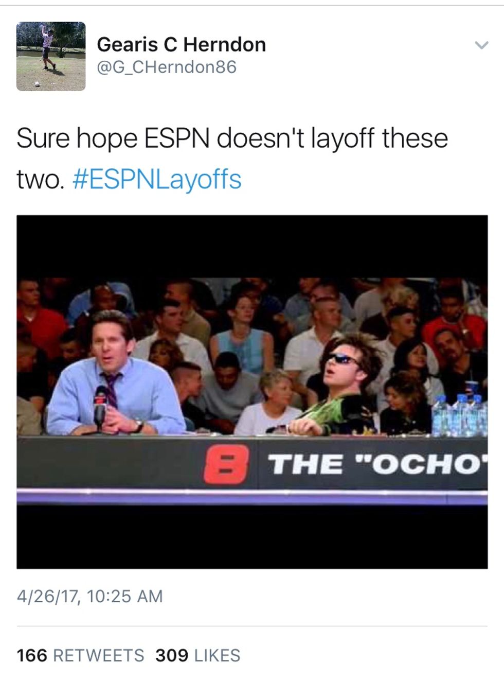 The most large and powerful outlet in the sports media industry laid off 100 staffers Wednesday, April 26. ESPN let go well-known staff, including NFL reporter Ed Werder, former NFL quarterbacks Trent Dilfer and Danny Kanell, former NBA player Len Elmore and many more. The network has seen a decline in viewers as people are going elsewhere to get information on sports. Although the laid off staff tweeted appreciations to the network for their many years, many fans took to twitter to hash out their anger and confusion. Beloved reporters and journalists are now a memory to ESPN.