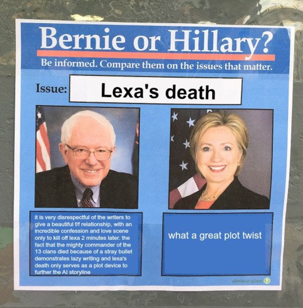After "The 100" killed off Lexa, many young, queer women have spoken about not only what the character meant to them, but how the death was ultimately a huge blow to what was once a growing confidence in their identities. How many more queer women do we need to kill? How many more young queer girls will feel like they're bound to end in tragedy? The answers to these questions actually keep people up at night because they have implications in the real world. This article lists some queer, female character deaths by how hard they hit home. While it is meant to be a lighthearted article, it isn't so far off from what actually happens. After Lexa died, many young women voiced not only their disappointment, but suicidal thoughts, worsening depression, fear and anxiety. Many of the older women in the community took it upon themselves to create a Tumblr post in which they talk about how they found happiness and love. Many people in the community have also banded together to fundraise. Chief TV critic for "Variety" writes, "There has been one positive development out of the Lexa debacle; fans have coordinated a campaign to raise more than $40,000 for the Trevor Project, a charity that assists LGBTQ teens in crisis. It’s a worthy cause and disgruntled fans of “The 100” are to be commended for channeling their ire in such a positive direction." The $50,000 goal may have seemed quite steep at first, but people have donated over $47,000 since the fundraiser went live. Some people decided to keep up the positivity and make some funny memes, but they also demonstrated the growing frustration with a trope that kills off characters with stray bullets, giving them meaningless deaths.