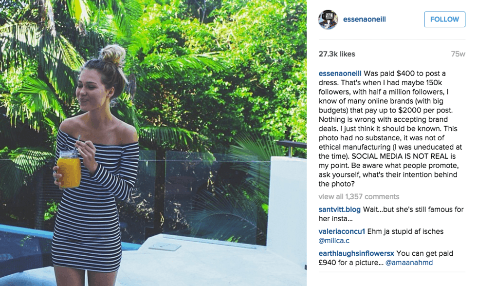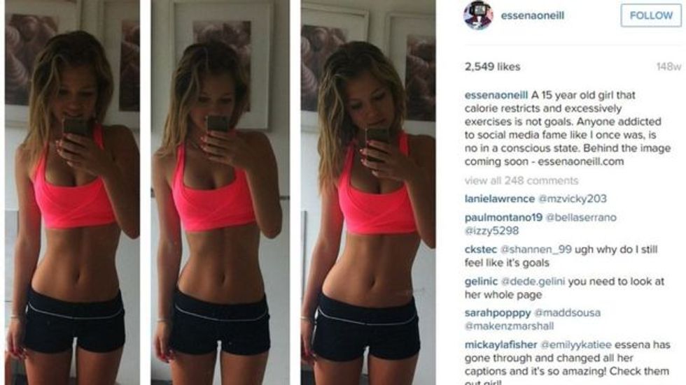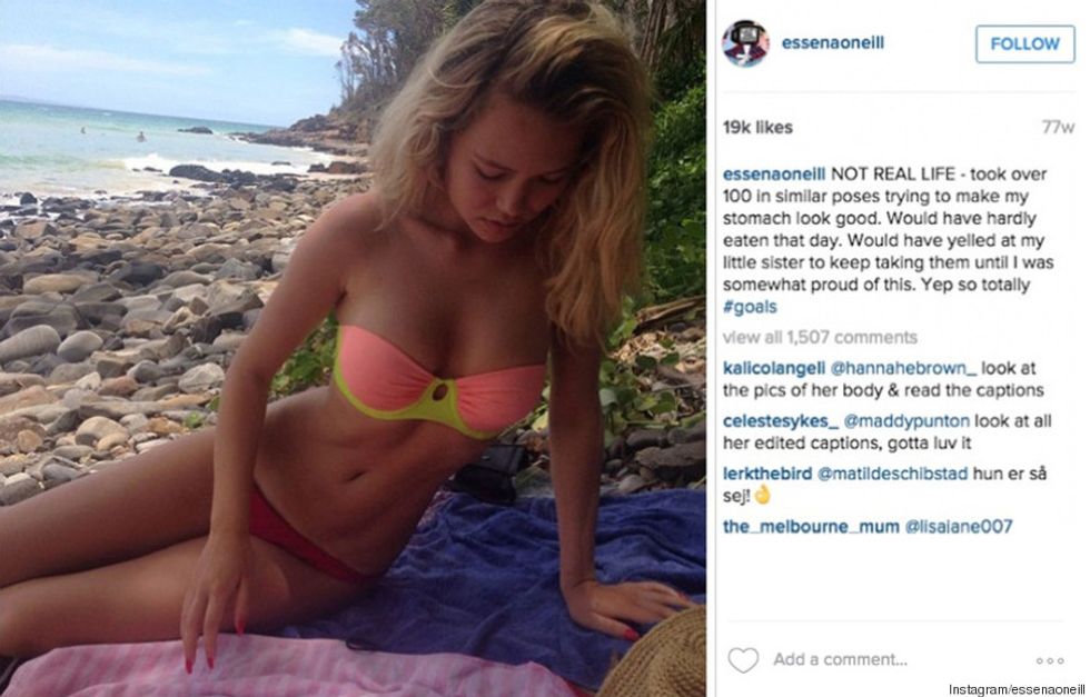 Above, one of her recently edited Instagram posts shows some of the reasons Essena has chosen to step off social media. She claims that the staged and contrived nature of this photo and the fact that she would have taken over a hundred similar pictures trying to get one that she thought was decent, means that the image portrays a view that is "NOT REAL LIFE." She also alludes to the fact that she had been restricting her diet in order to control her weight for photos on Instagram, another reason, she claims, that social media is harming teens.
