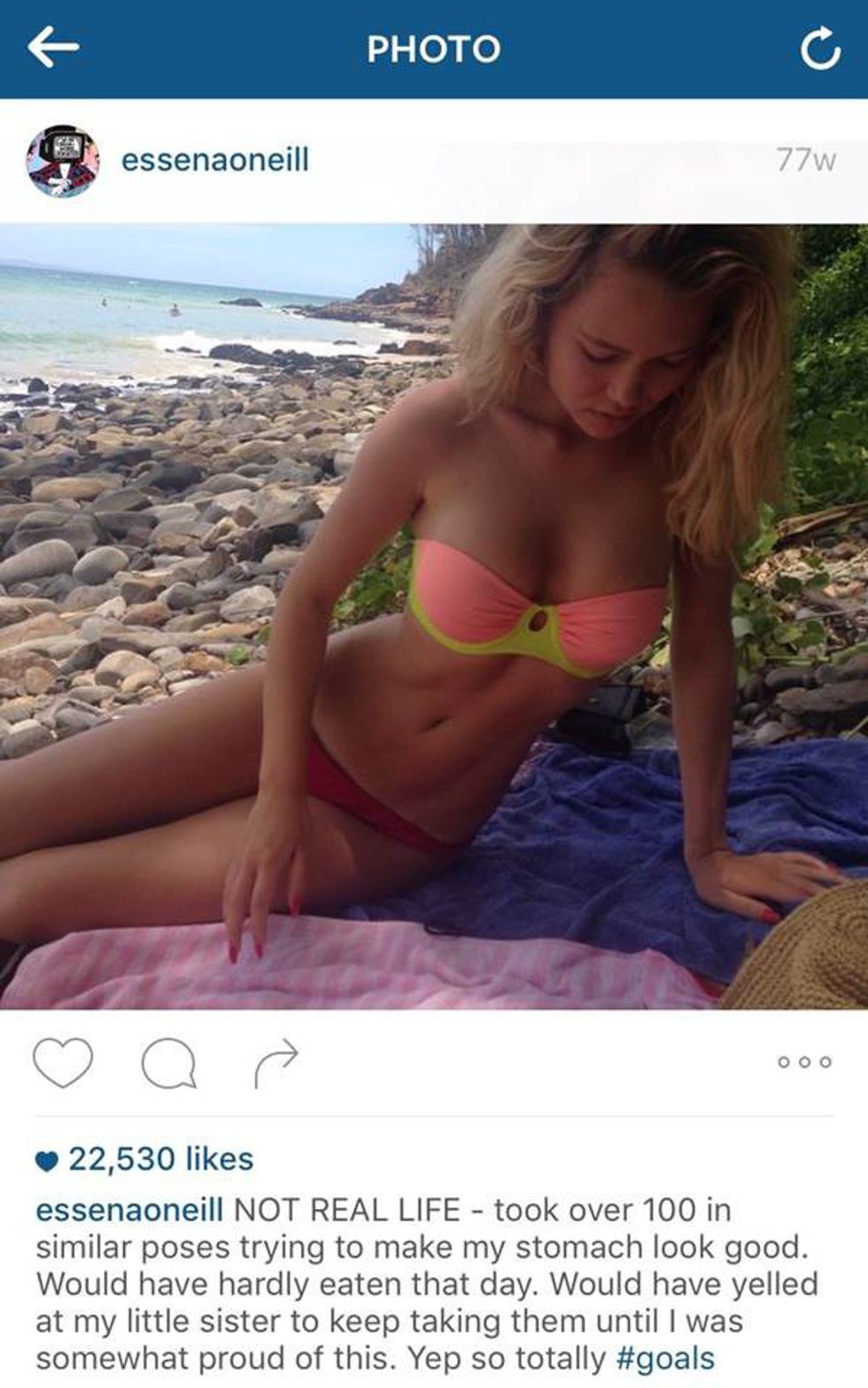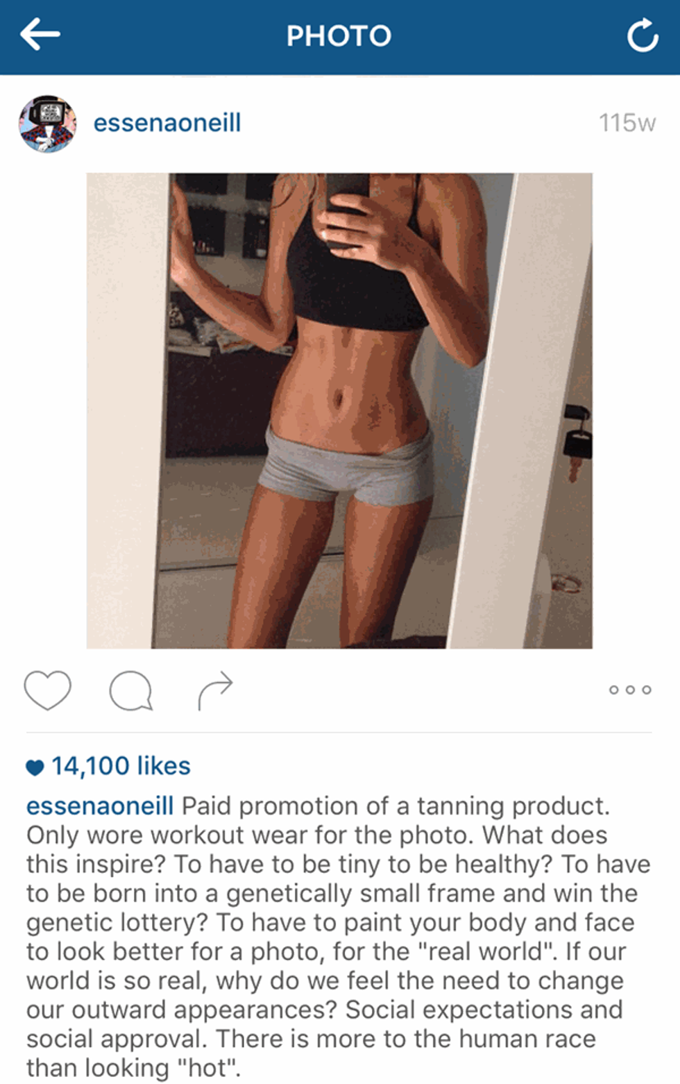 Back in November, the famous Instagram model Essena O’Neill from Australia, with over 900k followers called us as a society out. She decided to quit social media (including Instagram, Youtube and Tumblr) and changed her bio on Instagram to read “Social Media Is Not Real Life.” She proceeded to delete over 2,000 photos, and the ones she kept, she went back and edited all the captions to explain what was really going on when she took that photo. This was both a brave and bold statement, coming from someone who’s entire life revolves around social media and coming from someone who girls all around the world follow for “inspiration” and aspire to be like in every sense of the word. O’Neill took a stand and stated,