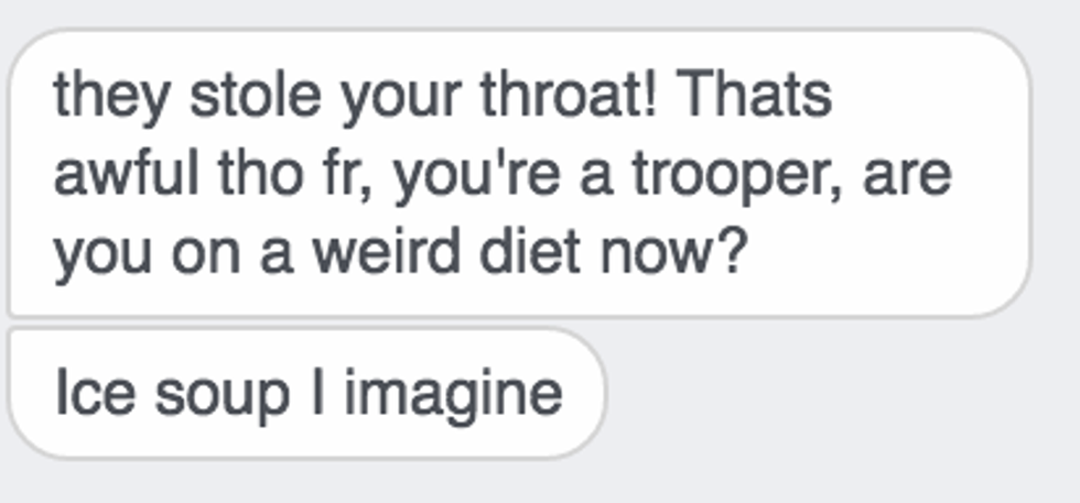 Surprise #1: LEMONADE HURTS. Dude. I love lemonade, but my throat and wounds back there were just not ready for the very tart and acidic flavors. I haven't tried anything really spicy yet, but I'm sure that it probably goes the same way and that kind of makes me sad too. What you're going to have to remember is that you have a very new wound at the back of your throat, so this really limits how much you can take back there. This is going to sound sad, but bland flavors might be your best friend. Following is an inquiry from my dear friend Satchel:
