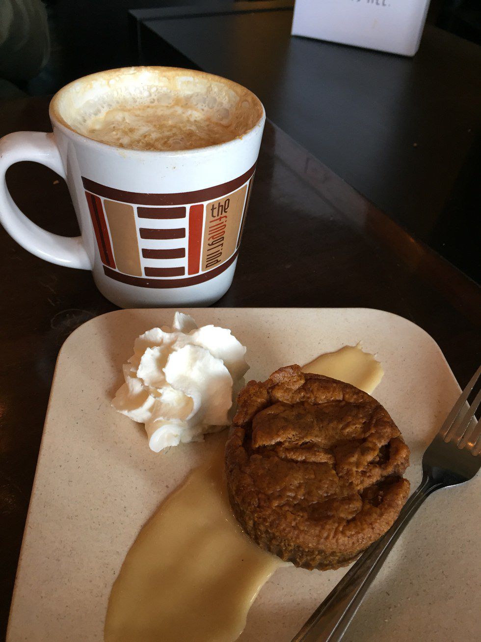 Pumpkin Muffin:This moist pumpkin muffin is the perfect treat for a fall day. To top if off, it comes with a creamy dip and side of fluffy whip cream.