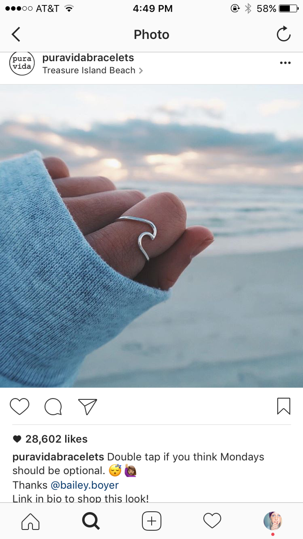 I was scrolling through Instagram when I stumbled upon a picture of a wave ring. I found one of these in a store a few years ago, but I talked myself out of buying it. Instantly regretting that decision, I have been searching for a wave ring for awhile now. I found the perfect sized one featured on an Instagram account called Pura Vida Bracelets.