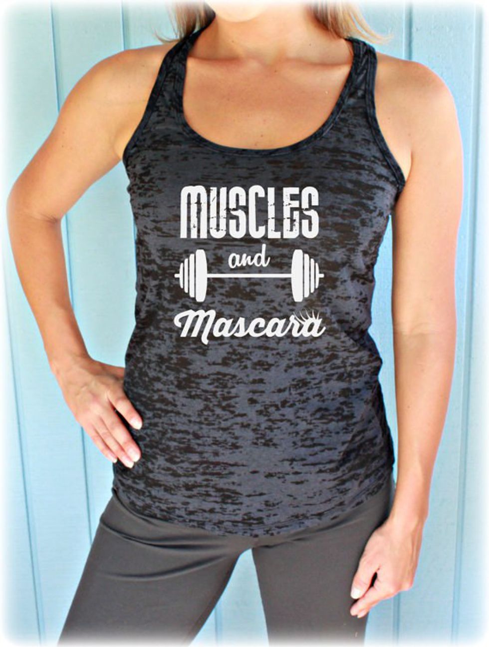 "Muscles and Mascara" is my most commented on tank top. I really like this one because it is very light and great for the cardio workouts and is well made. There are many combinations to get this shirt in and many sizes. $22.99.