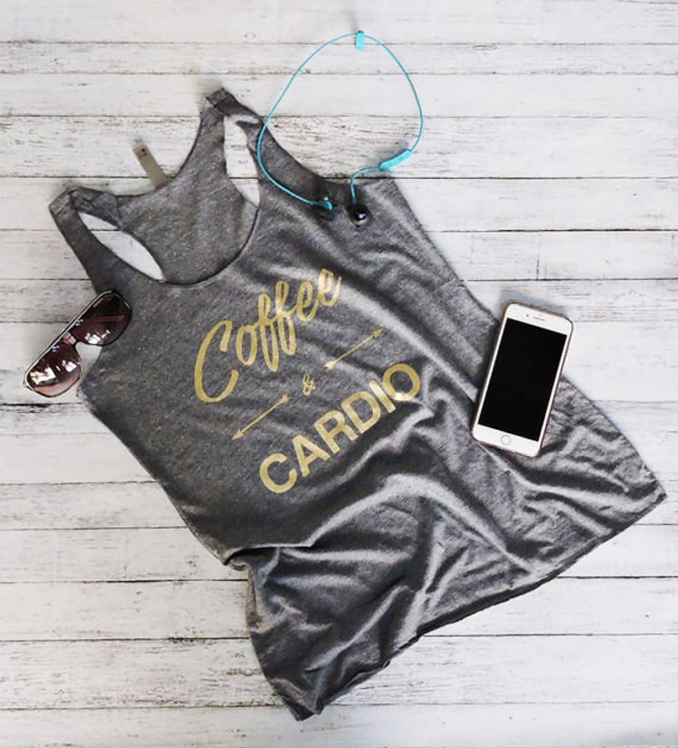 "Coffee and Cardio" workout tank is like the muscles and mascara one listed above. It's also a very high quality but light material that really is breathable. $15.99.