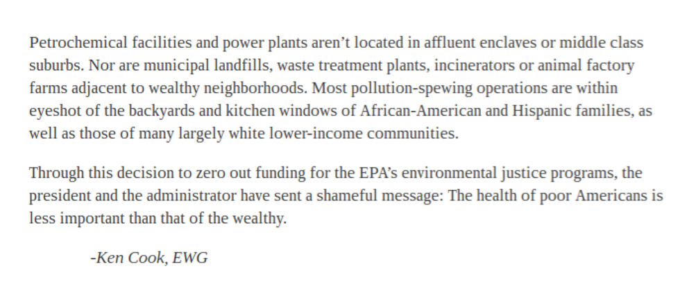Jerry Nelson of the Huffington Post zeroes in on Trump's proposal in No Protection For The Poor And Black As Trump Aims To Slash EPA:"This 'zero out' strategy will impact every neighborhood in America. The heaviest burden will be on the lives of low-earning Americans and people of color. Travis Nichols, a Greenpeace USA spokesman, calls the budget cut “environmental racism in action.”