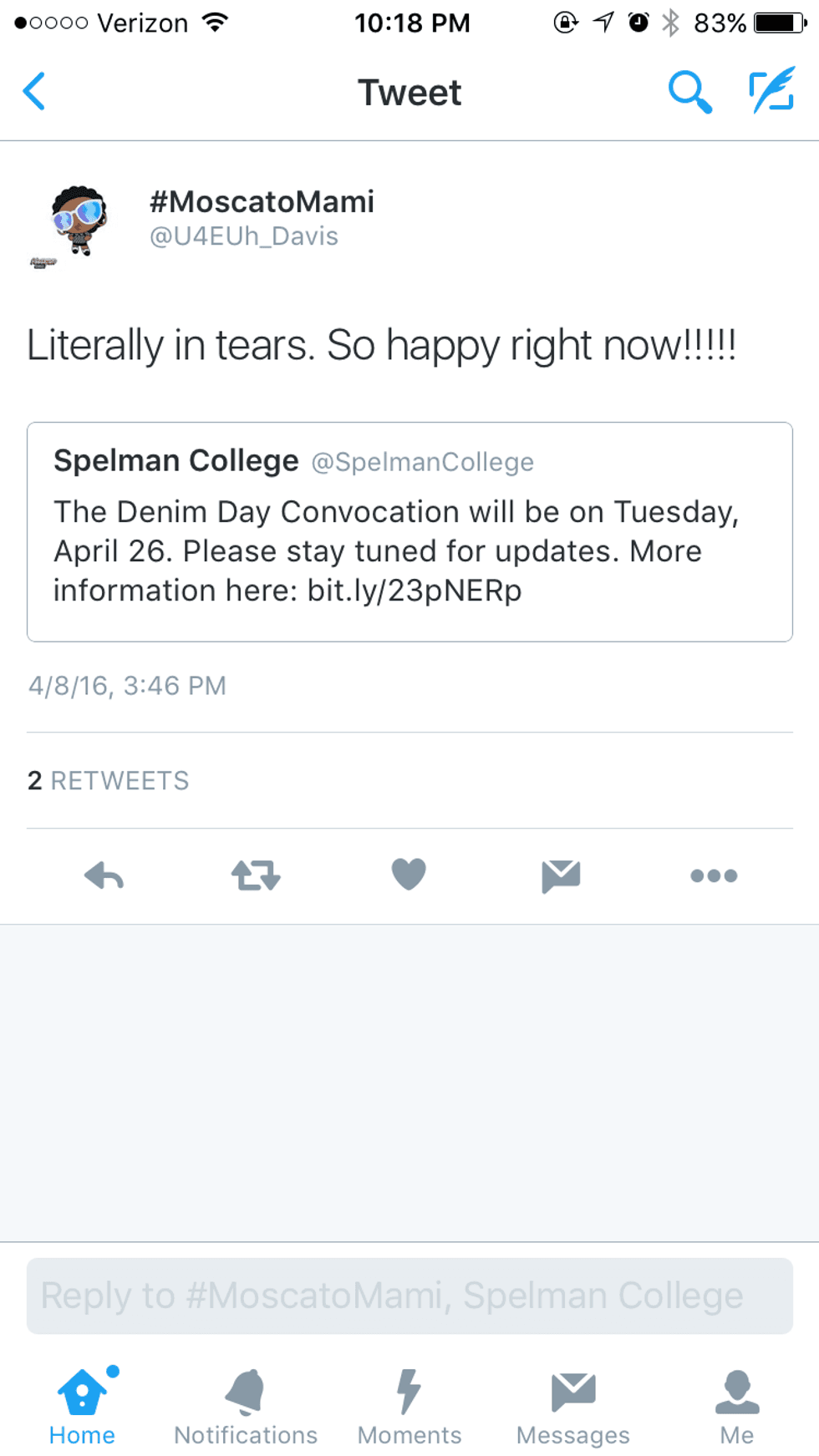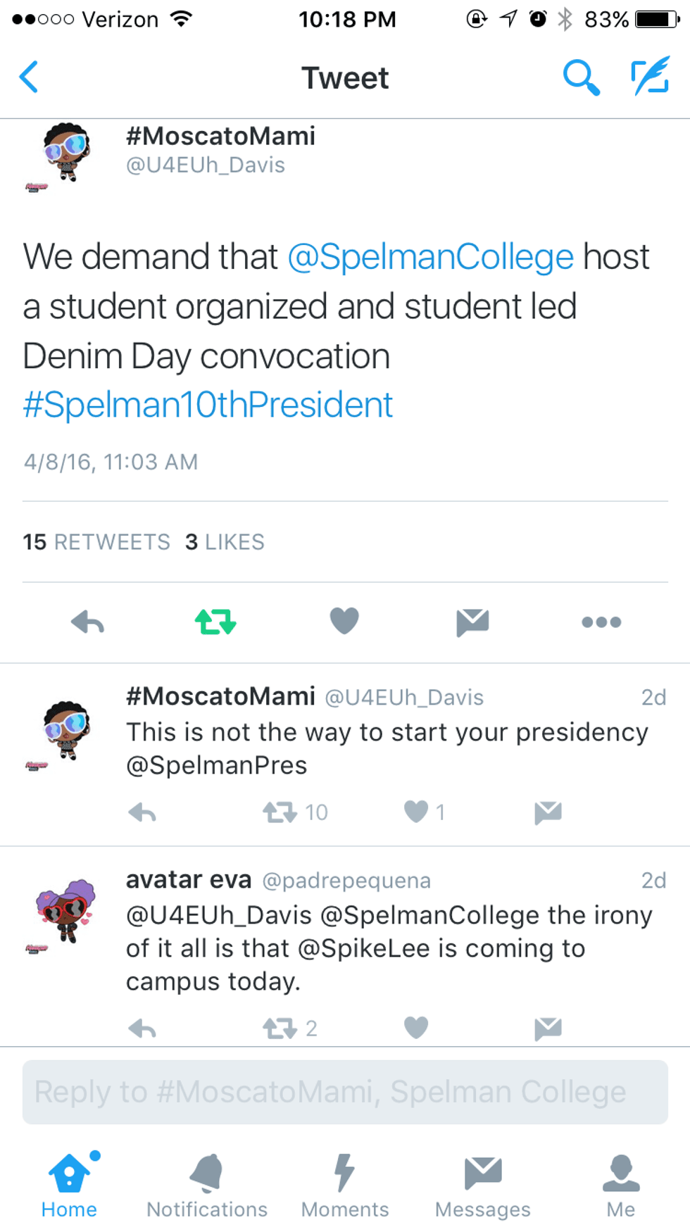 Euphoria used her Twitter as a platform to not only vent , but address the situation. Direct "@"s were used at Spelman President, Dr. Campbell and Spelman College. Her original thread can be found here:https://twitter.com/U4EUh_Davis/status/71845336459... She took the time to educate her twitter followers, address the situation at hand and knock on the big boss's door demanding to be heard and demanding a Denim Day convocation. With her accusations gaining traction, later that day at 12:39 p.m., nearly hours later a response was given from Spelman College’s twitter account.