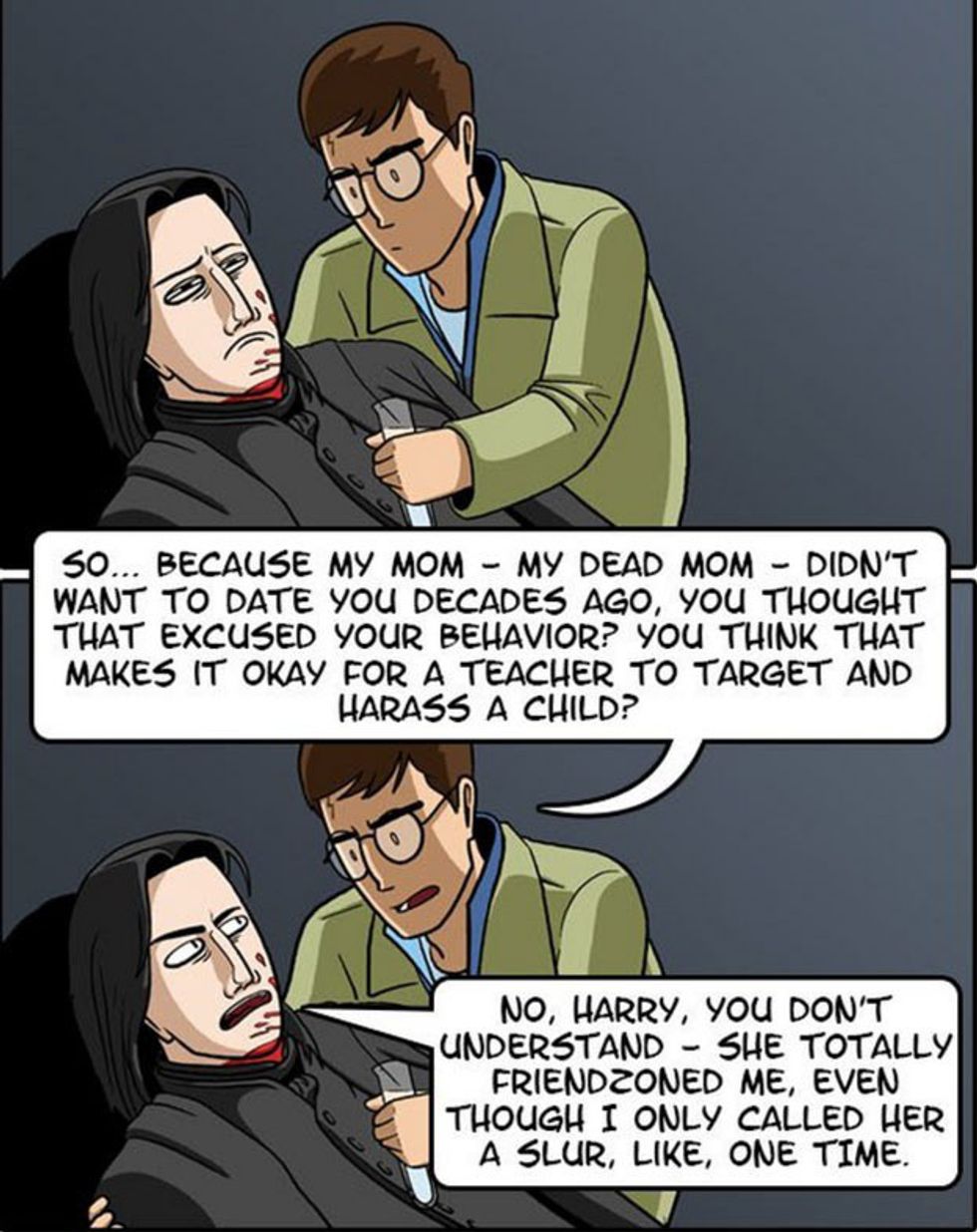 Snape's "tragic" backstory is revealed throughout the series in flashbacks, through Harry's occlumency lessons and quite a lot of the Golden Trio's meddling. Harry's mother was Snape's oldest, and often only, friend. He fell for her, a girl with eyes the color of April and a gait even God couldn't conjugate correctly, irregular as autumn and omniscient as every almost. However, we forget that love doesn't entitle him to any kind of absolute. Snape joined what is the equivalent of the real world's Ku Klux Klan— the Death Eaters cannot be defined as anything other than a hate group. Lily, being muggle-born, stood out as one of the main targets of hate crimes in the wizarding world. To make matters worse, when she confronted Snape about his involvement with the Death Eaters, he lashed out and spat a slur at her. While it's true that Harry's father, James, did jinx and ridicule Snape as a teenager, it never went further than that. He even saved Snape's life when his best friend, Sirius, decided to pull a perilous prank. This stands in sharp contrast to Snape, embittered for the rest of his life, bullying his students as retribution even years later, going as far as making 12-year-old Hermione cry over her teeth and threatening to kill Neville's pet in front of him.