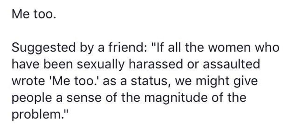 A few weeks ago I was lying in bed, scrolling through Twitter before I went to sleep. As I scrolled I started seeing the words "Me Too" a lot. I clicked on one and started reading to figure out why I was seeing it. The reason why I was seeing it was that Alyssa Milano had tweeted "If you’ve been sexually harassed or assaulted write ‘me too’ as a reply to this tweet."